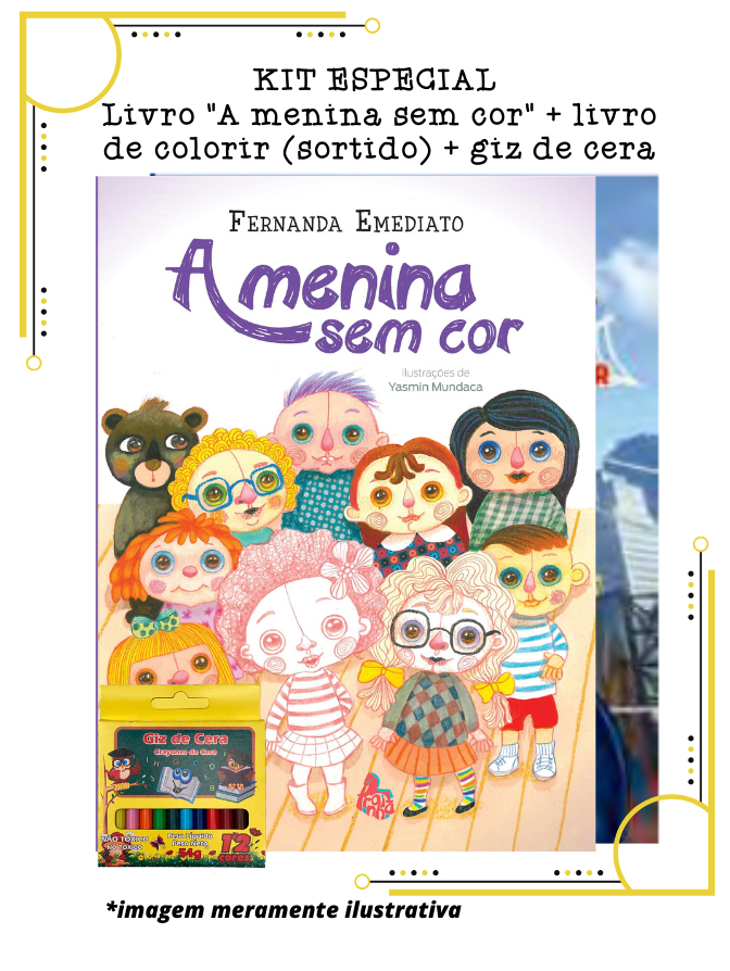 Este kit contém o livro "A menina sem cor", um livro de colorir sortido de 8 páginas e uma caixa de giz de cera com 12 cores. Mimi foi adotada ainda bebê, mas só descobre esse fato aos seis anos, ao perguntar aos pais por que, diferente deles, ela tem a pele escura. Após essa descoberta, Mimi passa a se questionar sobre as diferenças de cor e começa a desejar ter nascido branca. No meio desses questionamentos conhece Olívia, uma garotinha, também de seis anos, albina, que mostra a ela como é bom ser diferente e como todas as cores são bonitas e importantes.