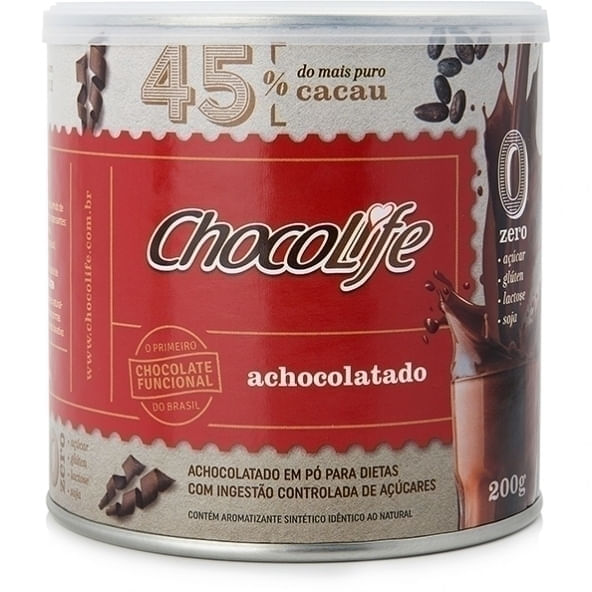 Informações técnicas do produto:<br> O Achocolatado, da Chocolife é um produto diferente dos achocolatados convencionais, é elaborado à base de cacau sem adição de açúcar. Com apenas 33 calorias por porção, é livre de soja, glúten, lactose e proteínas do leite.<br> <br> Recomendação de consumo:<br> Pode ser consumido pela manhã, nos lanches intermediários, além de ser um ótimo ingrediente para o preparo de bolos, tortas, shakes e vitaminas. <br> <br> Por que escolher esse produto?:<br> Sem conservantes<br> Zero adição de açúcar<br> Livre de corantes artificiais<br> Sem glúten<br> Sem lactose<br> Para veganos<br> Com cacau