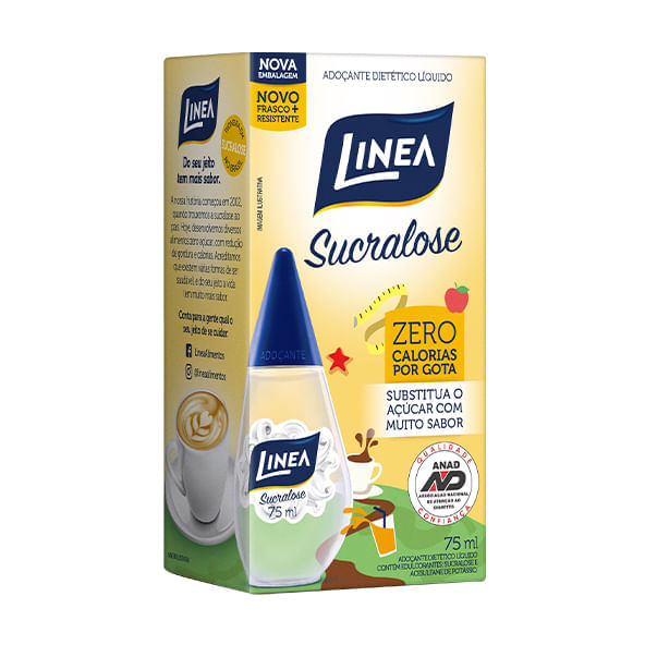 Informações técnicas do produto:<br> O Adoçante Sucralose Líquido, 75 ml, da Linea, possui menos calorias que o açúcar refinado e pode substituí-lo em suas preparações. Além disso, recebe selo de certificação da Associação Nacional de Atenção ao Diabetes (ANAD).<br> <br> Não contém sódio e glúten. Adoçante ideal para quem tem dietas com restrição de açúcar.<br> <br> Sobre os ingredientes:<br> Confira mais detalhes de alguns ingredientes presentes em sua composição:<br> <br> Sucralose: adoçante derivado da cana-de-açúcar, sem calorias e sem restrições de consumo. Com o sabor parecido com o do açúcar, a sucralose não deixa gosto amargo na boca.<br> Acesulfame de potássio: Edulcorante sintético e não calórico, rapidamente eliminado pelo organismo, confere sabor sem deixar gosto residual.<br> Recomendação de consumo:<br> Pode ser utilizado para adoçar bebidas ou preparações culinárias.<br> <br> Por que escolher esse produto?<br> Zero calorias por gota<br> Frasco mais resistente<br> Substitui o açúcar com muito sabor<br> Selo de qualidade ANAD<br> Sobre a marca:<br> A Linea é uma empresa que preza pelos 3S´s: Saúde, Sabor e Segurança. Desse modo, busca inspirar as pessoas a terem mais qualidade de vida e transformar suas visões sobre alimentação saudável, oferecendo sabor, prazer e segurança em forma de produtos deliciosos.