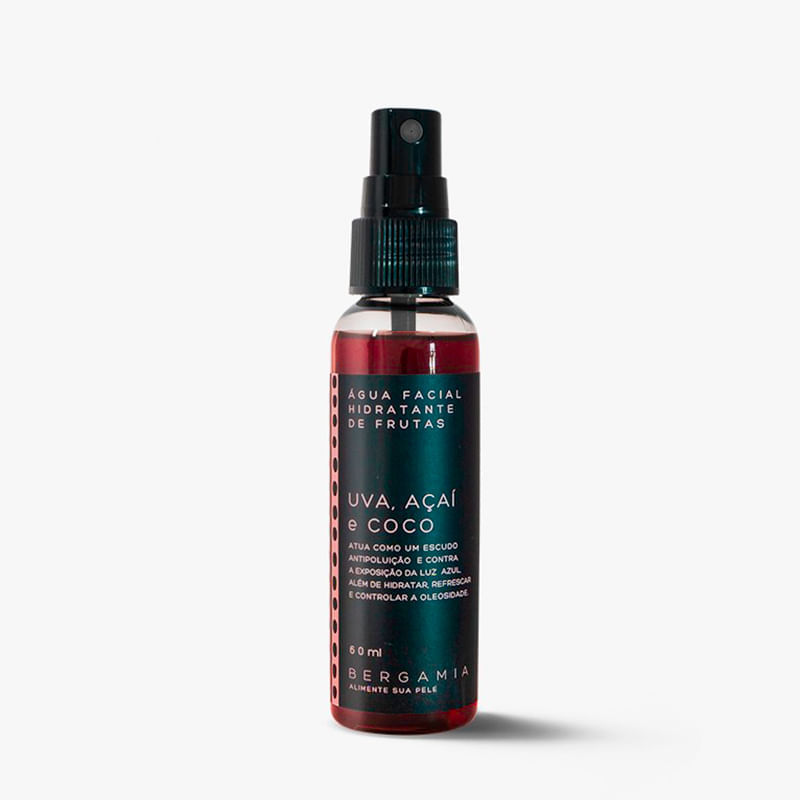 Informações técnicas do produto:<br> A Água facial hidratante de frutas uva, açaí e coco, da Bergamia, utiliza elementos naturais de flores e frutas, tais como açaí orgânico, água de uva orgânica, água de coco e extrato de café brasileiro, que refresca, equilibra o ph, hidrata e protege contra a poluição e luz azul que ficamos expostos diariamente.<br> Recomendações de uso:<br> Aplique o spray delicadamente no rosto e pescoço a qualquer hora do dia. <br> Por que escolher esse produto?<br> • Controla a oleosidade da pele<br> • Textura líquida<br> • Para todos os tipos de pele<br> • Aroma suave da lavanda<br> • Sensação de frescor na pele<br> Sobre a marca:<br> A Bergamia nasceu para mudar a forma como nossa geração olha para os rituais do dia-a-dia. A empresa acredita na potência da natureza, nas funções de suas substâncias e na sabedoria escondida, e formula cosméticos para inspirar, aprender, explorar e, dessa forma, viver uma vida mais natural.<br> <br>