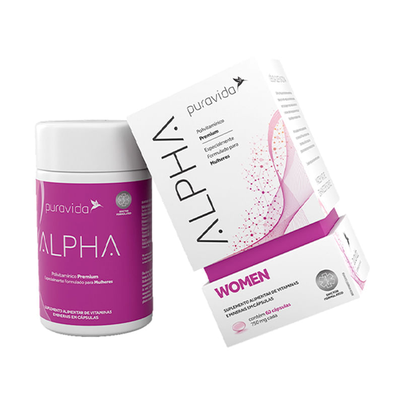 Informações técnicas do produto:<br> <br> O Alpha Women da Pura Vida, é um multivitamínico e polimineral que contém uma ampla quantidade de nutrientes essenciais para a saúde, levando em conta a forma, a dosagem e a interação desses nutrientes.<br> <br> Além de apresentar em sua composição vitaminas e minerais essenciais para o dia a dia, também há a presença de nutrientes especiais com função antioxidante e protetora.<br> <br> Recomendação de consumo:<br> <br> Consuma 2 cápsulas por dia no café da manhã ou no almoço ou conforme a orientação do médico ou nutricionista.<br> <br> Por que escolher esse produto?<br> Nutrientes essenciais selecionados<br> Contém licopeno, luteína e zeaxantina que apresentam função antioxidante e protetora<br> Com minerais importantes para os ossos e dentes<br> Com vitamina A: importante para visão<br> Com Vitamina B12 (metilcobalamina): melhor absorvida<br> Vitaminas do complexo B lipossomadas<br> Não contém glúten<br> Sobre a marca:<br> <br> A Pura Vida é uma empresa com o propósito de promover uma alimentação sem comidas artificiais, pobres em nutrientes, ricas em conservantes, pesticidas, gorduras hidrogenadas ou com açúcar em excesso. Preocupa-se, com o impacto da alimentação na qualidade de vida e no meio ambiente, utilizando produtos frescos e de produção recente obtidos de cultivadores confiáveis e além de utilizar tecnologias para preservar, realçar e concentrar as propriedades dos alimentos.