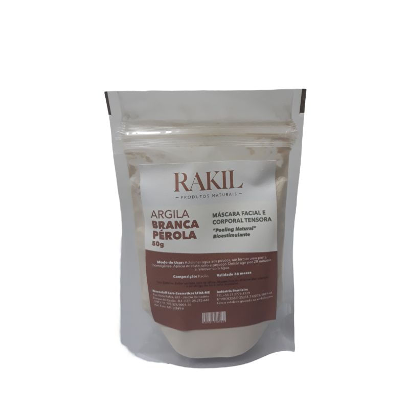 <p>A <strong>Argila pérola</strong>, da <strong>Rakil</strong>, 50g, é uma máscara facial e corporal tensora que pode ser usada em todo o corpo. É um micro esfoliante para a pele que ajuda a remover o excesso de oleosidade, reduzir rugas e minimizar sinais de expressão.</p> <h2>Sugestão de uso:</h2> <p>Para utilizar, adicione água gradualmente até formar uma pasta homogênea. Aplique no rosto, colo e pescoço, deixando agir por 20 minutos antes de remover com água. </p> <p>Destinado apenas para uso externo. Evite o contato com os olhos.</p> <h2>Motivos para escolher o produto:</h2> <ul> <li> <p>Micro esfoliante</p> </li> <li> <p>Redução da oleosidade da pele</p> </li> <li> <p>Auxilia na redução das rugas e sinais de expressão</p> </li> <li> <p>Máscara facial e corporal tensora</p> </li> </ul> <h2>Sobre a marca:</h2> <p>A <strong>Rakil </strong>é uma empresa com produtos naturais que podem trazer uma beleza saudável para o seu rosto e corpo. Seus produtos são 100% naturais, feitos com ingredientes provenientes da Amazônia e de outras riquezas naturais do Brasil. A empresa possui o Certificado de Qualidade ANVISA, garantindo que os produtos passaram por testes rigorosos para garantir sua segurança, eficácia e qualidade. São comprometidos com a sustentabilidade, utilizando ingredientes naturais e renováveis, e nunca testados em animais.</p>