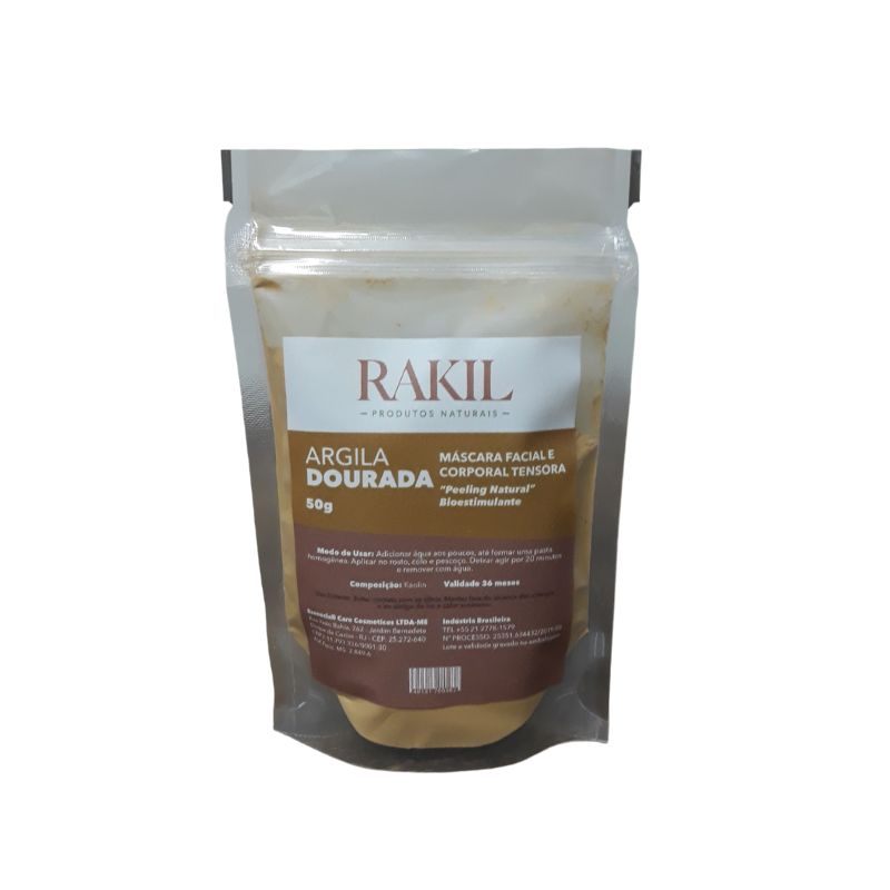 <p>A <strong>Argila dourada</strong>, da <strong>Rakil</strong>, 50g, é uma máscara facial que pode ser usada para<strong> tratar acne e reduzir manchas</strong>, o produto apresenta propriedades adstringentes sem ressecar a pele, além disso, revitaliza, hidrata, nutre e combate a flacidez. </p> <h2>Sugestão de uso:</h2> <p>Para utilizar, adicione água gradualmente até formar uma pasta homogênea. Aplique no rosto, colo e pescoço, deixando agir por 20 minutos antes de remover com água. </p> <p>Destinado apenas para uso externo. Evite o contato com os olhos.</p> <h2>Motivos para escolher o produto:</h2> <ul> <li> <p>Utilizada no tratamento de acne</p> </li> <li> <p>Auxilia na redução de manchas da pele</p> </li> <li> <p>Peeling natural</p> </li> <li> <p>Bioestimulante</p> </li> <li> <p>Máscara facial e corporal tensora</p> </li> </ul> <h2>Sobre a marca:</h2> <p>A <strong>Rakil </strong>é uma empresa com produtos naturais que podem trazer uma beleza saudável para o seu rosto e corpo. Seus produtos são 100% naturais, feitos com ingredientes provenientes da Amazônia e de outras riquezas naturais do Brasil. A empresa possui o Certificado de Qualidade ANVISA, garantindo que os produtos passaram por testes rigorosos para garantir sua segurança, eficácia e qualidade. São comprometidos com a sustentabilidade, utilizando ingredientes naturais e renováveis, e nunca testados em animais.</p> <p> </p>