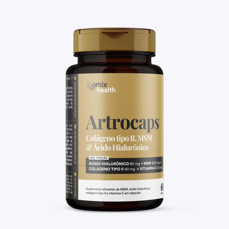 <p>O Artrocaps da Omix Health é um suplemento alimentar em cápsulas, elaborado com 40mg de colágeno tipo II, metilsulfonilmetano, ácido hialurônico e vitamina C. A embalagem possui 60 cápsulas, rendendo por 30 doses.</p> <h2><strong>Sobre os ingredientes:</strong></h2> <p><strong>Colágeno tipo II: </strong>o colágeno tipo II não desnaturado auxilia na manutenção da função articular.</p> <h2><strong>Sugestão de consumo:</strong></h2> <p>Consumir 2 cápsulas ao dia, ou conforme orientação do médico ou nutricionista. </p> <h2><strong>Motivos para escolher o produto:</strong></h2> <ul> <li> <p>Sem glúten e sem lactose;</p> </li> <li> <p>Rende 30 doses;</p> </li> <li> <p>40mg de colágeno tipo II por dose;</p> </li> <li> <p>Enriquecido com vitamina C;</p> </li> </ul> <h2><strong>A Marca:</strong></h2> <p>A marca Omix nasceu no estado do Rio de Janeiro, atua produzindo e distribuindo suplementos alimentares há mais de 25 anos, com a missão em levar bem-estar, saúde e melhor performance aos seus clientes. Seus produtos são elaborados com matérias-primas de qualidade, que passam por rigoroso controle de qualidade, desde a fabricação até a chegada ao consumidor final.</p> <p> </p>