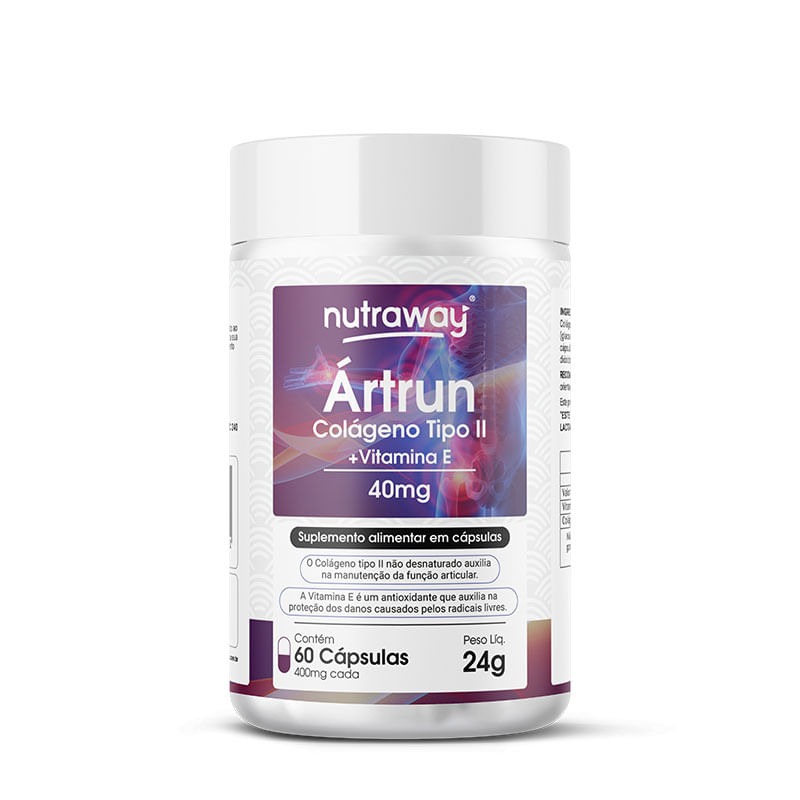 <h2 style="text-align: justify;"><strong>Artrum Colágeno Tipo II Nutraway 40mg 60caps</strong></h2> <p style="text-align: justify;">A <strong>Artrum Colágeno Tipo II Nutraway</strong> é um suplemento alimentar que fornece 40 mg de colágeno tipo II na porção, combinado com vitamina E que colabora para a absorção da substância pelo corpo e ainda potencializa sua produção </p> <p> </p> <h2 style="text-align: justify;">Sugestão de consumo:</h2> <p style="text-align: justify;">Ingerir 1 cápsula ao dia, ou conforme orientação de nutricionista ou médica. </p> <h2 style="text-align: justify;">Motivos para escolher o produto:</h2> <ul style="list-style-type: disc;"> <li>Sem glúten</li> <li>Sem açúcar</li> <li>Fornece 40mg de colágeno do tipo 2</li> </ul> <p style="text-align: justify;"> </p> <h2 style="text-align: justify;">A Marca</h2> <p style="text-align: justify;">A <strong>NutraWay</strong> é uma Indústria de alimentos para o bem estar que atua em todo o Brasil desde 1981 sempre primando pela qualidade dos produtos, fornecendo alimentos e nutracêuticos da mais alta qaulidade, levando assim mais saúde para nossos consumidores.</p>