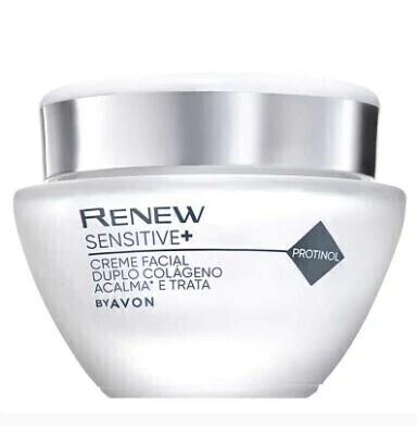PODEROSO TRATAMENTO ANTISSINAIS QUE ACALMA* A PELE<br /> • Formulado com Protinol, que ajuda a aumentar o colágeno para uma pele mais elástica e firme**• Reduz a aparência de linhas finas, rugas e também a sensibilidade da pele• Formulado com ativos calmantes* que deixam a pele do rosto menos sensível a cada uso e ajudam a suavizar a vermelhidão e coceira da pele em 72 horas• Fortalece a barreira de hidratação, melhorando o poder de recuperação da pele**• É um creme de textura leve e rápida absorção, que não pesa na pele<br /> E mais: é testado dermatologicamente, hipoalergênico, livre de fragrâncias e corantes.Indicado para mulheres e homens a partir de 18 anos que possuem pele sensível e querem tratar linhas finas e rugas.<br /> Resultado:ImediatamenteAlivia o ressecamento e acalma* a pele1 semanaSensação de nutrição e elasticidade2 semanasSensação de pele preenchida, mais uniforme e menos sensível<br /> Rendimento de até 93 aplicações.<br /> VOCÊ SABIA?<br /> 70% dos brasileiros têm algum tipo de sensibilidade na pele.***Os principais sintomas são vermelhidão, coceira, ardência, pele áspera ou repuxada.<br /> *Suaviza a vermelhidão e efeitos de irritação da pele.**Baseado em teste com células da pele.***Fonte Acturus Skin Sensitivity and Ingredient Understanding Research, 2016.Composição<br /> Dicas de UsoLimpe bem a pele com o Sabonete Cremoso Sensitive+ e seque a pele.Aplique o seu Renew Sensitive + Creme Duplo Colágeno pelo rosto e pescoço.Se estiver usando o produto pela manhã espere que ele seja absorvido e aplique o protetor solar e a maquiagem.<br /> Contém: 50g