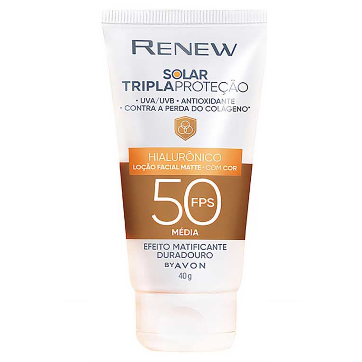 Renew apresenta o novo Solar Tripla proteção alta eficácia com alto conforto, protege e prepara a pele contra os danos dos Raios UVA/UVB, antioxidante e contra a perda de colágeno* ao mesmo tempo que é fácil de espalhar e proporciona um acabamento uniforme e matte. Muito além de proteção solar, tripla proteção com efeito matificante duradouro, que protege e trata cosmeticamente a pele sem pesar. Nova fórmula, com tecnologia tripla proteção e mais efeito matte*. Tripla proteção com textura leve que previne o envelhecimento, preenche linhas finas através da hidratação e com 5 opções de tonalidade para você encontrar a sua. Novas cores, também para peles retintas! Para quem já usa bases de Avon, encontrar seu tom ficou ainda mais fácil, são 5 cores, que combinam com os tons das bases de maquiagem Avon. Nova cor desenvolvida para a pele da brasileira. Minimiza os efeitos causados pela luz visível e pelos raios infravermelhos. Indicado para pele muito sensível a queimadura solar. Tecnologia de proteção avançada. *Baseado em teste in vitro. **É necessária a reaplicação do produto a cada 2 horas para manter a sua efetividade.