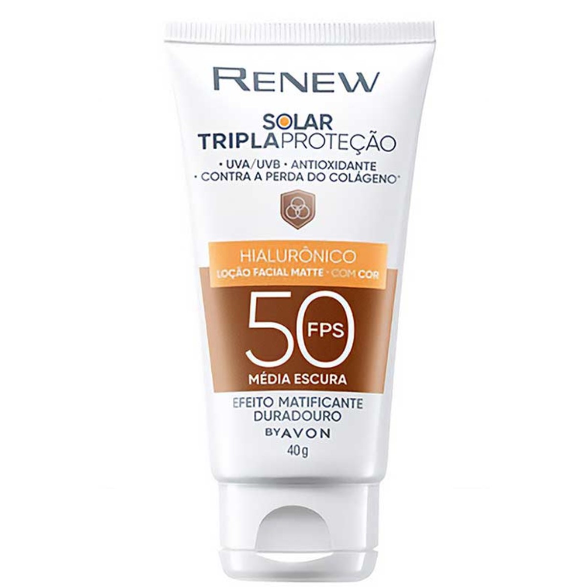 Renew apresenta o novo Solar Tripla proteção alta eficácia com alto conforto, protege e prepara a pele contra os danos dos Raios UVA/UVB, antioxidante e contra a perda de colágeno* ao mesmo tempo que é fácil de espalhar e proporciona um acabamento uniforme e matte. Muito além de proteção solar, tripla proteção com efeito matificante duradouro, que protege e trata cosmeticamente a pele sem pesar. Nova fórmula, com tecnologia tripla proteção e mais efeito matte*. Tripla proteção com textura leve que previne o envelhecimento, preenche linhas finas através da hidratação e com 5 opções de tonalidade para você encontrar a sua. Novas cores, também para peles retintas! Para quem já usa bases de Avon, encontrar seu tom ficou ainda mais fácil, são 5 cores, que combinam com os tons das bases de maquiagem Avon. Nova cor desenvolvida para a pele da brasileira. Minimiza os efeitos causados pela luz visível e pelos raios infravermelhos. Indicado para pele muito sensível a queimadura solar. Tecnologia de proteção avançada. *Baseado em teste in vitro. **É necessária a reaplicação do produto a cada 2 horas para manter a sua efetividade.