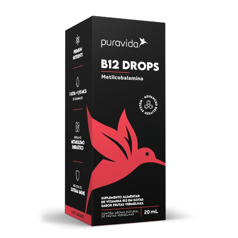 <h2 style="text-align: justify;"><strong>B12 Drops 20ml Puravida </strong></h2> <h2 style="text-align: justify;">A <strong>B12 drops Puravida</strong>, é um suplemento alimentar de vitamina B12, em sua forma ativa, metilcobalamina, que possui melhor absorção, em gotas com sabor natural de frutas vermelhas.</h2> <h2 style="text-align: justify;"><strong>Sobre o ingrediente:</strong></h2> <h2 style="text-align: justify;"><strong>Vitamina B12: </strong>é uma vitamina importante para o metabolismo energético, além de contribuir para o sistema imunológico e prevenção de anemias.</h2> <h2 style="text-align: justify;"><strong>Sugestão de consumo:</strong></h2> <h2 style="text-align: justify;">Adultos acima de 19 anos e gestantes: consumir 1 gota ao dia ou conforme recomendação do médico ou nutricionista. <br />Agite antes de beber.</h2> <h2 style="text-align: justify;"><strong>Motivos para escolher o produto:</strong></h2> <h2 style="text-align: justify;">● 1 gota possui 9,90mcg de Vitamina B12;</h2> <h2 style="text-align: justify;">● Na forma de metilcobalamina, em sua forma biodisponível, possui melhor absorção; <br />● Vegano;</h2> <h2 style="text-align: justify;">● Sem corantes, conservantes e aromatizantes artificiais;</h2> <h2 style="text-align: justify;">● Sem glúten.</h2> <h2 style="text-align: justify;"> </h2> <h2 style="text-align: justify;"><strong>A Marca</strong></h2> <h2 style="text-align: justify;">Puravida é uma empresa que nasceu com o propósito de facilitar a prática de um estilo de vida orgânico. Acreditam que a qualidade daquilo que escolhemos comer, pode afetar o funcionamento do nosso corpo, funcionamento dos órgãos, humor, foco e mente. Através de suas vitaminas, suplementos, cosméticos, granolas, colágenos e outros produtos elaborados com ingredientes de altíssima qualidade podem contribuir com a sinergia do corpo.</h2> <h2 style="text-align: justify;"> </h2> <h2 style="text-align: justify;"> </h2>