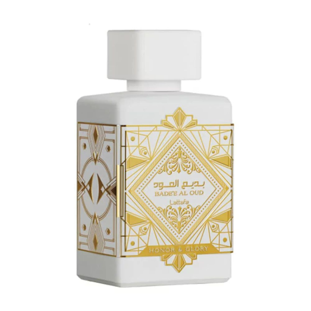 Bade'e Al Oud Honor & Glory, a mais recente adição à distinta linha Bade'e Al Oud da Lattafa, é uma fragrância que personifica a verdadeira elegância e o luxo. Esta é a escolha definitiva para aqueles que desejam destacar-se com uma sofisticação excepcional.<br /> <br /> Notas Principais:<br /> <br /> A jornada olfativa de Bade'e Al Oud Honor & Glory começa com uma combinação única de abacaxi e Creme Brulee, proporcionando uma entrada exótica e doce que instantaneamente cativa os sentidos. À medida que a fragrância se desenvolve, o coração revela uma fusão complexa de canela, benjoim, cúrcuma e pimenta preta, criando uma aura calorosa e profundamente envolvente. A base é habilmente construída com baunilha, cashmeran, sândalo e musgo, conferindo uma durabilidade excepcional e um toque de luxo que perdura.
