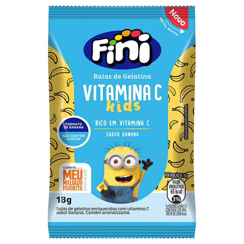 <p>A <strong>Bala Bem Estar Vitamina C Kids Minions Banana</strong>, da <strong>Fini</strong>, é uma bala de gelatina em formato de banana, que fornece 30 mg de vitamina C na porção.</p>_x000D_ <p>É adoçada com açúcar demerara, um açúcar que preserva mais vitaminas e minerais em relação ao refinado.</p>_x000D_ Sobre os ingredientes:_x000D_ <p>•        <strong>Vitamina C: </strong>auxilia no funcionamento do sistema imune, além de disso, é um antioxidante que auxilia na proteção dos danos causados pelos radicais livres.</p>_x000D_ Por que escolher este produto?_x000D_ <p>•        Sem glúten</p>_x000D_ <p>•        Com açúcar demerara</p>_x000D_ <p>•        Livre de corantes e aromas artificiais</p>_x000D_ <p>•        Formato de banana</p>_x000D_ <p>•        Enriquecida com vitamina C</p>_x000D_ Sobre a marca:_x000D_ <p>A Fini é uma empresa de origem espanhola com presença mundial desde a década de 70 como uma das principais produtoras mundiais de balas de gelatina, marshmallows, tubes e chicles. A visão da marca é proporcionar produtos e serviços de qualidade, inovação excelência com um ambiente próspero e parcerias sustentáveis.</p>