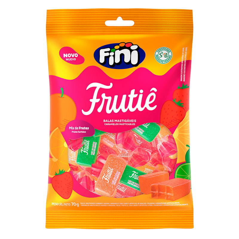 <p>A <strong>Frutiê Mix de Frutas</strong>, da <strong>Fini</strong>, é uma <strong>bala Vegana </strong>certificada pela Sociedade Vegetariana Brasileira (SBV)<strong>,</strong> super cremosa, macia e com sabor sortido de frutas: morango, lima-limão, laranja e abacaxi. Experimente cada sabor!</p> Benefícios: <ul> <li>Certificada pela SVB</li> <li>Sem glúten</li> <li>Sem lactose</li> <li>Vegana</li> </ul> A marca: <p>A Fini é uma empresa de origem espanhola com presença mundial desde a década de 70 como uma das principais produtoras mundiais de balas de gelatina, marshmallows, tubes e chicles. A visão da marca é proporcionar produtos e serviços de qualidade, inovação excelência com um ambiente próspero e parcerias sustentáveis.</p>