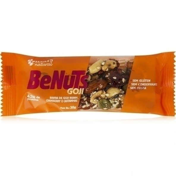 BeNuts Goji, da Hart´s Natural é uma barra composta por um mix de nuts, como amendoim e amêndoas, além de semente de abóbora, goji berry e cranberry. Possui 4,2g de proteína, é livre de glúten, aditivos químicos, como corantes e conservantes e gordura trans.