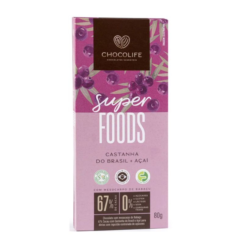 <h2 style="text-align: justify;"><strong> Superfoods Castanha Com Açai 80G</strong> <strong>Chocolife</strong></h2> <h2 style="text-align: justify;">O tablete de <strong>Chocolate 67% cacau </strong>sabor <strong>Castanha do Brasil e Açaí</strong> da linha <strong>Superfoods Chocolife</strong> é uma deliciosa e nutritiva combinação do cacau intenso, com a crocância e alto teor nutricional da castanha associados ao toque do açaí. Ele não tem adição de açúcar, não contém glúten e nem lactose e possui selo de certificação FODMAP Friendly. Você vai se surpreender com essa explosão de sabores.</h2> <h2 style="text-align: justify;"><strong>Sobre os ingredientes:</strong></h2> <h2 style="text-align: justify;"><strong>Alérgicos:</strong> Contém castanha do Brasil</h2> <h2 style="text-align: justify;"> </h2> <h2 style="text-align: justify;"><strong>Sugestão de consumo:</strong></h2> <h2 style="text-align: justify;">Uma alternativa saudável para sua sobremesa ou para aqueles momentos em que bate uma vontade de comer doce.</h2> <h2 style="text-align: justify;"><strong>Motivos para escolher o produto:</strong></h2> <ul style="text-align: justify;"> <li> <h2>Vegano e funcional;</h2> </li> <li> <h2>Certificação FODMAP Friendly;</h2> </li> <li> <h2>Fonte de fibras;</h2> </li> <li> <h2>Zero adição de açúcar;</h2> </li> <li> <h2>Sem glúten;</h2> </li> <li> <h2>Sem leite;</h2> </li> </ul> <h2 style="text-align: justify;"> </h2> <h2 style="text-align: justify;"><strong>A Marca</strong></h2> <h2 style="text-align: justify;">A Chocolife desenvolve produtos para atender pessoas que prezam por uma alimentação saudável, livre de açúcares e ingredientes alergênicos. Sendo a empresa que trouxe ao mercado o primeiro chocolate funcional no Brasil e criou o primeiro chocolate branco zero açúcar e vegano. O diferencial da marca está na produção sustentável do chocolate saudável, desde a colheita do cacau, de origem amazônica, até o processo final de fabricação, com ingredientes criteriosamente selecionados, proporcionando uma combinação perfeita entre a qualidade nutricional e o sabor, agradando a todos os paladares.</h2> <h2 style="text-align: justify;"> </h2>
