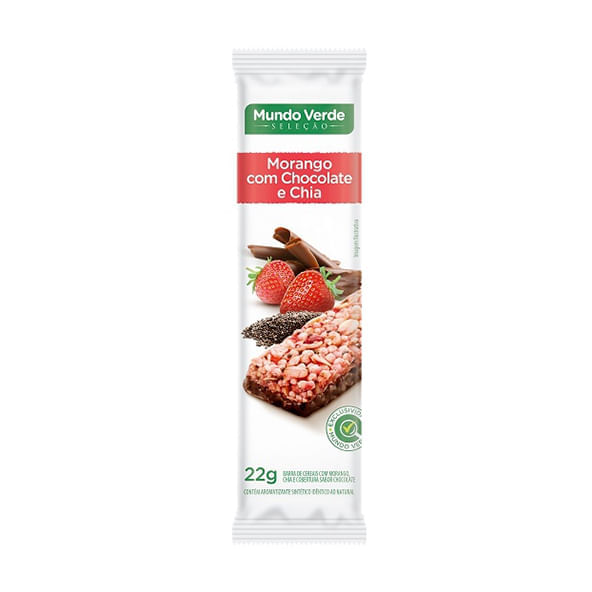 Descrição:<br> A Barra de cereal de morango com chocolate e chia Mundo Verde Seleção, é feita com flocos de aveia, trigo, arroz, milho e morango com chocolate. Opção prática para o lanche entre as refeições.<br> <br> Sugestão de consumo<br> Pode ser incluída no lanche da manhã e lanche da tarde. De fácil transporte pode ser consumida em qualquer outro momento do dia. <br> <br> Motivos para escolher o produto:<br> Opção prática de lanches entre as refeições<br> <br> Baixo teor de gorduras saturadas<br> <br> Não contém colesterol<br> <br> Não contém gorduras trans<br> <br> A marca:<br> A Mundo Verde Seleção é uma linha de produtos para quem quer ter uma vida mais saudável e gostosa. A marca quer ajudar a colocar essas escolhas em prática. A paixão e conhecimento pelos alimentos, nutrientes, aromas e sabores permitem a seleção das melhores opções saudáveis para qualquer ocasião. Desenvolvidos para deixar o dia a dia mais gostoso e prático.