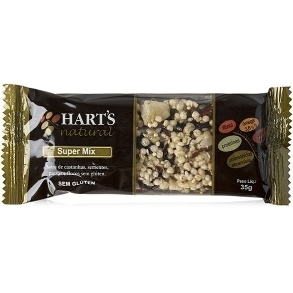 Barra Super Mix, Cereais, Sementes, Castanhas e Passas, da Hart's Natural possui uma combinação de flocos de arroz, quinoa, semente de linhaça, gergelim, castanha do Pará, amêndoas, uva passa e mel. Rica em fibras, além de não conter glúten, lactose, corantes e aromas artificiais.