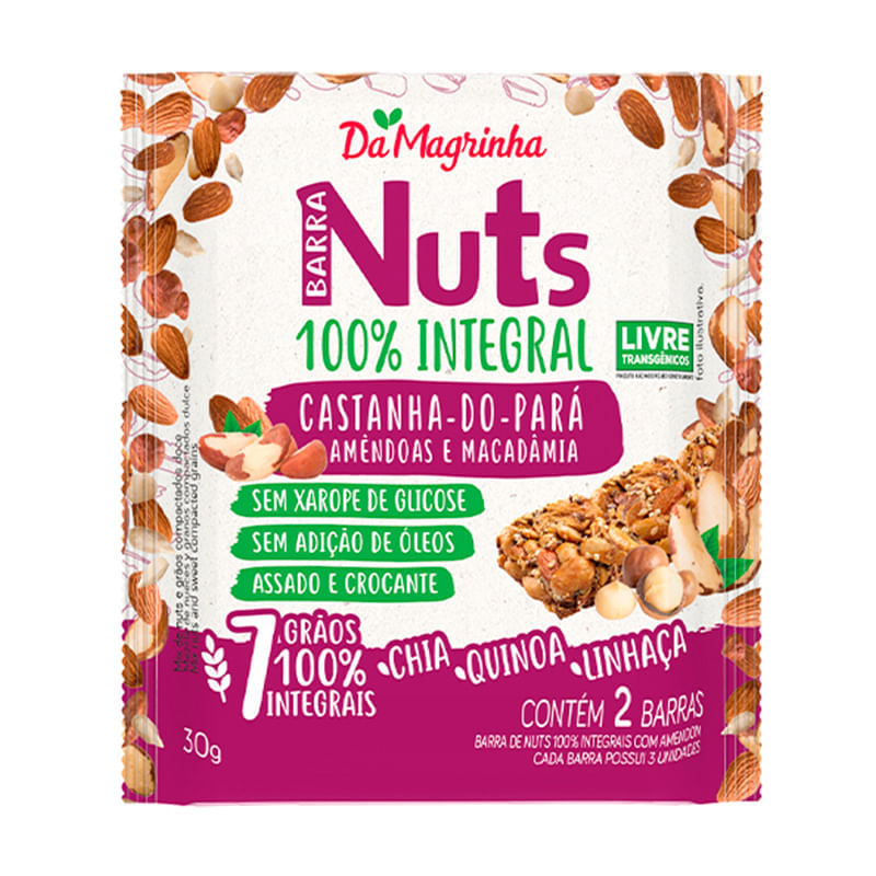 Informações técnicas do produto:<br> As Barras de Nuts Integral de Castanha do Pará, da Da Magrinha, 35 g, são deliciosos snacks feitos com 7 grãos 100% integrais. Opção perfeita para aqueles que buscam uma alimentação saudável e não abrem mão da praticidade. Cada porção oferece apenas 74 kcal.<br> <br> Sobre os ingredientes:<br> Castanha do Pará: Elevado teor de selênio, fitoesteróis, folato, magnésio, vitamina E, proteínas e fibras.<br> Amendoim: Rico em ácidos graxos mono e poli-insaturados, proteína e fibras, além de fonte de ferro, vitaminas A e E, e compostos com função antioxidante.<br> Amêndoa: Rica em nutrientes como fibras, proteínas, vitamina E, magnésio, vitamina B2 e fósforo<br> Açúcar Mascavo: Diferente do açúcar de mesa, o açúcar mascavo não passa pelo processo de refinamento, o que mantém as vitaminas e os sais minerais da cana-de-açúcar.<br> Recomendação de consumo:<br> As Barras de Nuts Integral de Castanha do Pará são ideais para serem consumidos nas refeições intermediárias e para lanches rápidos.<br> <br> Por que escolher esse produto?<br> 100% integral<br> 7 grãos<br> Fonte de fibras<br> Zero gorduras trans<br> Sem adição de óleo<br> Sobre a marca:<br> A Da Magrinha é a 1ª marca do Brasil com tudo 100% integral. Tudo 100% assado, com Certificado Internacional Whole Grain, livre de transgênicos, 7 grãos nobres, embalagens em stand up pouch com zíper que abre e fecha, e com 40% de redução de plásticos. Produtos artesanais, saudáveis, gostosos e integral de verdade!