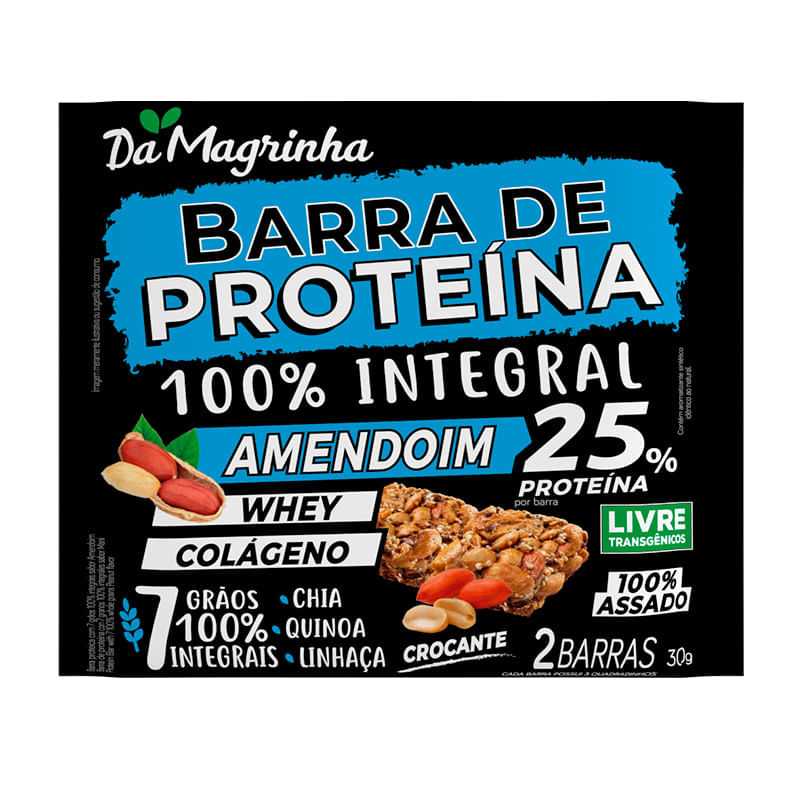 <p>A Barra proteica 100% integral possui em sua composição 7 grãos integrais, Colágeno e Whey. É 100% assada, livre de transgênicos e com 25% de proteína, além de ser crocante e deliciosa!</p> Sobre os ingredientes: <p>Amendoim, proteína texturizada de soja, açúcar mascavo, melado, pasta de amendoim, gotas de chocolate meio amargo, 7 grãos 100% integral (semente de girassol, flocos de arroz integral, centeio em flocos, gergelim, linhaça, chia e quinoa), crispies de proteína isolada de soja, cacau em pó, proteína isolada de soja, proteína concentrada de soro de leite, colágeno hidrolisado, estabilizante goma xantana, aroma e extrato de alecrim.</p> Alergênicos:<p> contém amendoim e derivados, derivados de soja, derivados de cevada, centeio e derivados de leite. Pode conter castanha do pará, macad mia, amêndoas, trigo, pistache, aveia, avelã e castanha de caju. Contém glúten. Contém lactose.</p> Sugestão de uso: <p>Pode ser consumido a qualquer hora do dia como alternativa de lanche.</p> Motivos para escolher o produto: <ul> <li> <p>100% assado</p> </li> <li> <p>25% de proteína</p> </li> <li> <p>Livre de transgênicos</p> </li> <li> <p>Com Whey e Colágeno</p> </li> </ul> Sobre a marca: <p>Fundada há mais de 25 anos em Florianópolis, <strong>Da Magrinha</strong> foi incorporada pelo grupo Hathor em 2012 com o objetivo de se tornar umas das marcas mais importantes do segmento no Brasil, criando produtos gostosos, artesanais, saudáveis e integrais de verdade!</p>