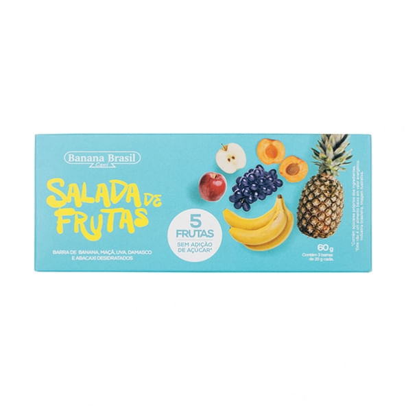 Informações técnicas do produto:<br> A Barra Salada de Frutas, da Banana Brasil, é uma barrinha feita com frutas desidratadas ideal para ser consumida nos lanches intermediários. É fonte de fibras, não tem adição de açúcar e não contém glúten ou sódio.<br> <br> Recomendações de consumo:<br> A Barra Salada de Frutas é gostosa e prática, sendo uma ótima opção para levar sempre com você e matar a fome no meio do dia!<br> <br> Por que escolher este produto:<br> Prático<br> Não contém glúten<br> Zero adição de açúcar<br> Zero sódio<br> Fonte de fibras<br> Sobre a marca:<br> A Banana Brasil iniciou suas atividades em 1985, com a desidratação da banana. Ao longo do tempo, foi ampliando seu portfólio de produtos, e hoje em dia procura desenvolver opções de snacks saudáveis e nutritivos, sem adição de açúcar e sem glúten ou sódio. Os produtos são feitos a partir de ingredientes naturais que incluem frutas, sementes e castanhas.