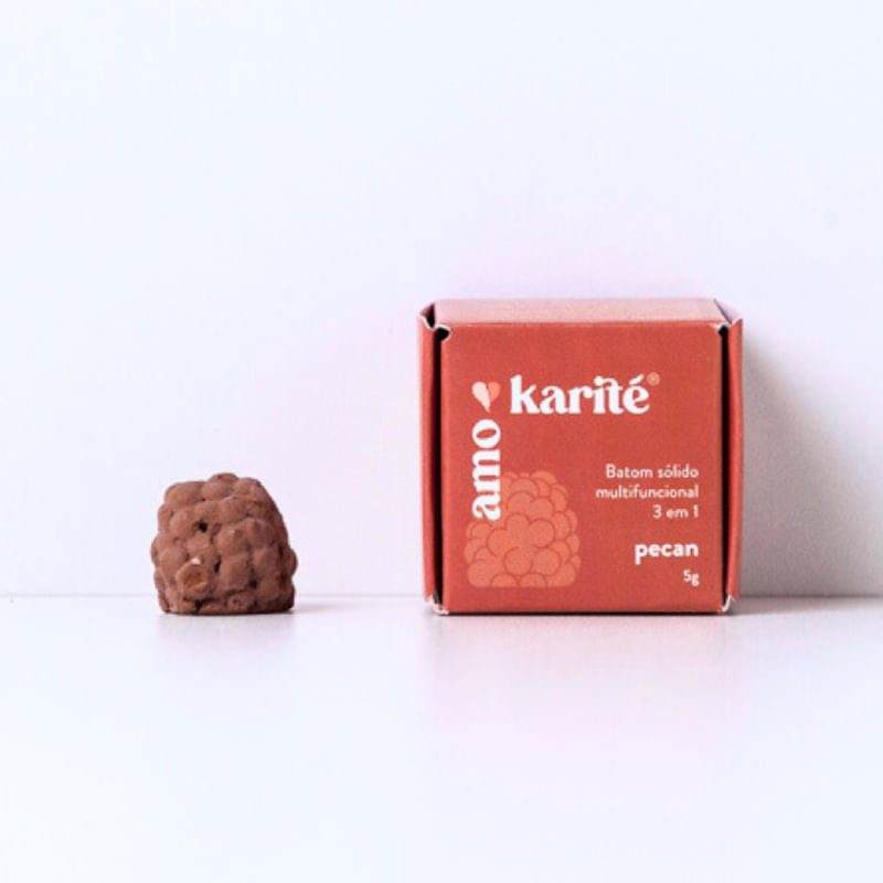 <p>O <strong>Batom Sólido Multifuncional 3 em 1 Pecan da Amokarité</strong>, possui um formato de frutinha inconfundível com fórmula 100% natural, esse batom pode ser usado como <strong>blush, batom, sombra, delineador ou contorno</strong>.</p> <p>Ele combina pigmentação incrível com hidratação profunda, deixando sua pele nutrida e radiante. Com embalagem é biodegradável, reforça o compromisso da Amokarité com o meio ambiente ao evitar o uso de plástico e promover o conceito de reutilização.</p> <h2><strong>Sugestão de uso: </strong></h2> <p>Aplique diretamente nos lábios, bochechas ou pálpebras, espalhando com os dedos ou com um pincel para obter o efeito desejado.</p> <p>Para intensificar a pigmentação, amasse um pedaço do batom com uma espátula e aplique na região desejada.</p> <p>Você pode utilizá-lo em diversas áreas do rosto e corpo, criando looks variados e únicos.</p> <p>Para um acabamento mais sequinho e duradouro, selar com o Pó Translúcido Banana ou o Pó Mineral Cacau Glow. Se preferir um visual mais hidratante, combine com o Lip Balm da Amokarité.</p> <h2><strong>Motivos para escolher o produto:</strong></h2> <ul> <li>Multifuncionalidade: pode ser usado como batom, blush, sombra e delineador</li> <li>Sustentabilidade: a embalagem é biodegradável</li> <li>100% natural e vegano</li> <li>Livre de petrolatos, parabenos, sulfatos e metais pesados</li> <li>Clean Beauty e Skin Food: pigmenta e trata a pele</li> <li>Alta durabilidade</li> </ul> <h2><strong>A Marca:</strong></h2> <p>A Amokarité nasceu com o propósito de oferecer maquiagens e cosméticos que respeitem tanto o corpo quanto o planeta, com produtos inovadores e totalmente livres de ingredientes de origem animal. A marca se tornou uma referência em cosméticos veganos e ecológicos, com transparência em seus insumos e embalagens que minimizam o impacto ambiental.</p>