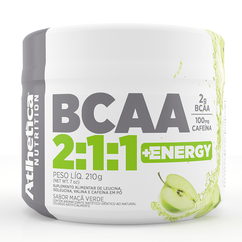 <p>Informações técnicas do produto:<br>O BCCA 2:1:1 Energy Maçã Verde, da Atlhetica Nutrition, 210g, é um suplemento a base de três aminoácidos de cadeia ramificada (valina, leucina e isoleucina) conhecidos pela sigla BCAA.<br><br>Oferece 100mg de cafeína por porção. Estes aminoácidos não são produzidos naturalmente pelo organismo humano, então podem ser obtidos por meio da alimentação ou da suplementação.<br><br>Recomendações de uso:<br>Acrescente a dose de 7g (1 dosador cheio) em 200 ml de água mineral na coqueteleira e agite bem até completa diluição.<br><br>Consuma no pré ou durante o treino (para indivíduos saudáveis a partir de 19 anos), ou conforme recomendação médica/nutricional.<br><br>Por que escolher esse produto?<br>2g de BCAA na porção<br>Sem glúten<br>100g de cafeína por porção<br>Com vitamina B6<br>Proporção 2:1:1 – 2 partes de leucina, para 1 de valina e 1 de isoleucina<br>Sem lactose<br>Sobre a marca:<br>A Atlhetica, é uma empresa no qual os produtos são desenvolvidos pela ADS Laboratório Nutricional, que produz suplementos alimentares inovadores com alta qualidade e tecnologia avançada, é considerada a maior indústria de suplementos alimentares do Brasil. Os produtos são fabricados seguindo as normas estabelecidas pela ANVISA e pelas Boas Práticas de Fabricação, proporcionando a qualidade, bem-estar e eficácia.</p>