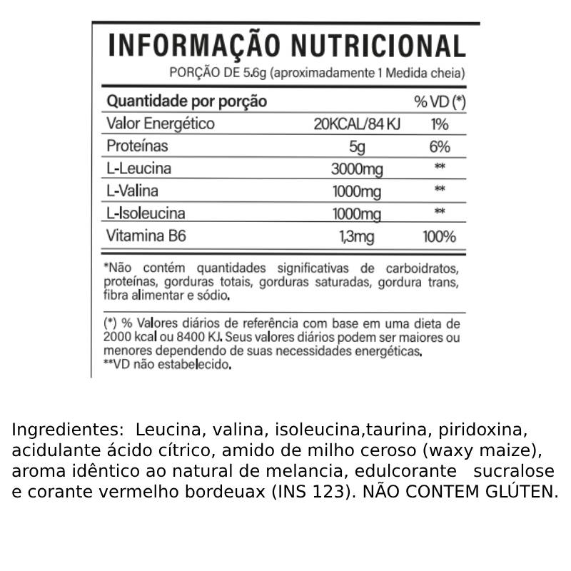 <p>A <strong>BCAA Real da Canibal Inc</strong> é um suplemento alimentar em pó, com sabor de melancia. A composição foi desenvolvida a partir da combinação dos aminoácidos leucina, isoleucina e valina com a vitamina B6 e o Waxy Maize.</p>_x000D_ <h2><strong>Sobre os ingredientes:</strong></h2>_x000D_ <p>BCAA: são aminoácidos essenciais de cadeia ramificada que contribuem com a manutenção e recuperação da musculatura e tecidos, reduzindo a fadiga durante a prática de atividades físicas intensas e melhorando a sensação de dor muscular pós treino.</p>_x000D_ <h2><strong>Sugestão de consumo:</strong></h2>_x000D_ <p>Consumir 5,6g (1 dosador) diluído em 200ml de água, ou conforme orientação do médico ou nutricionista.</p>_x000D_ <h2><strong>Motivos para escolher o produto:</strong></h2>_x000D_ <ul>_x000D_ <li>_x000D_ <p>3000mg de leucina;</p>_x000D_ </li>_x000D_ <li>_x000D_ <p>1000mg de isoleucina;</p>_x000D_ </li>_x000D_ <li>_x000D_ <p>1000mg de valina;</p>_x000D_ </li>_x000D_ <li>_x000D_ <p>1,3mg de vitamina B6;</p>_x000D_ </li>_x000D_ <li>_x000D_ <p>Baixo em calorias;</p>_x000D_ </li>_x000D_ <li>_x000D_ <p>Sabor melancia; </p>_x000D_ </li>_x000D_ <li>_x000D_ <p>Zero adição de açúcares;</p>_x000D_ </li>_x000D_ <li>_x000D_ <p>Rende cerca de 53 doses;</p>_x000D_ </li>_x000D_ <li>_x000D_ <p>Sem glúten e sem lactose.</p>_x000D_ </li>_x000D_ </ul>_x000D_ <h2><strong>A Marca:</strong></h2>_x000D_ <p>A Canibal Inc foi fundada no ano de 2017 com a missão de revolucionar o mercado de suplementos alimentares, a empresa trabalha com produtos focados em bem-estar, emagrecimento, ganho de força e aumento de massa muscular. Cada produto é desenvolvido com base em pesquisas e uso de matéria prima premium, trazendo ciência aliada a alta performance.</p>_x000D_ <p> </p>