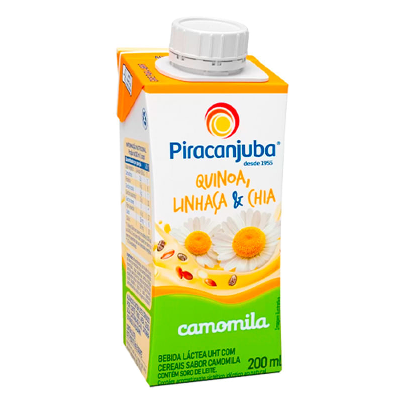 <p>Informações técnicas do produto:<br><br>A Bebida Láctea com Cereais sabor de Camomila, da Piracanjuba, de 200ml, é feita com leite, quinoa, linhaça, chia e chá de camomila. Um produto livre de glúten e transgênicos.<br><br>Além disso, é fonte de fibras, fornecendo 4,3g do nutriente por porção.<br><br>Recomendação de consumo:<br><br>Consuma gelado, é uma ótima opção para lanches intermediários, como desjejum e lanche da tarde.<br><br>Alergênicos:<br><br>Contém leite e derivados.<br><br>Por que escolher esse produto?<br>Não contém glúten<br>Fonte de fibras<br>Zero gordura trans<br>Livre de transgênicos<br>Livre de corantes e adoçantes artificiais<br>Sobre a marca:<br><br>A Piracanjuba, é uma empresa criada em 1955 em Goiás, com a missão de fornecer produtos e serviços de qualidade, seguros e inovadores, que colabore para tornar as pessoas mais felizes e saudáveis.</p>