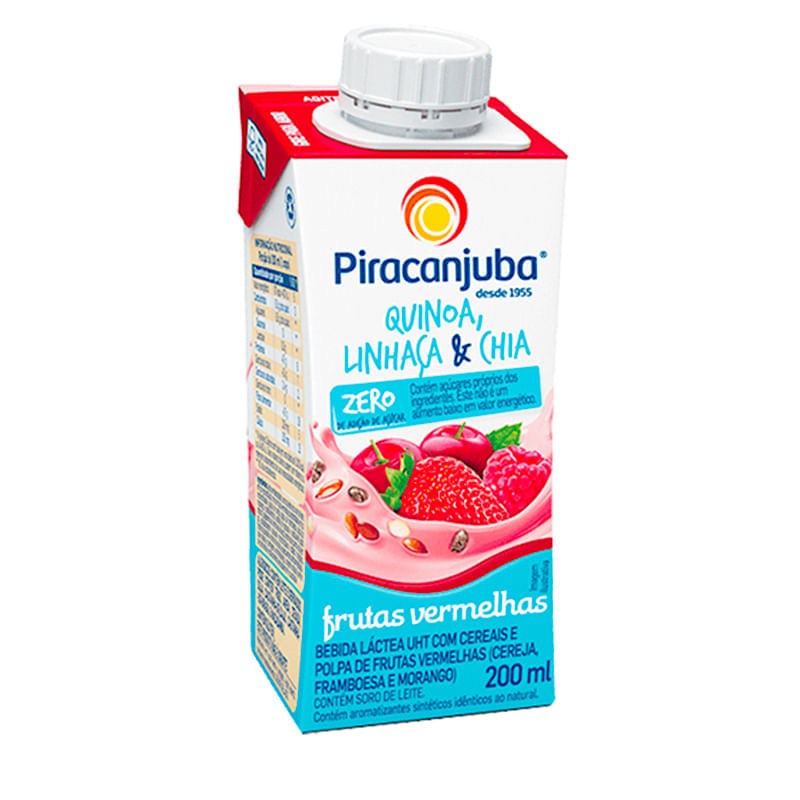 <p>Informações técnicas do produto:<br>A Bebida Láctea com Cereais sabor de Frutas Vermelhas Zero Açúcar, da Piracanjuba, de 200ml, feita com leite, linhaça, quinoa, chia e mix de frutas vermelhas. Além disso, é fonte de fibras.<br>Sobre os ingredientes:<br>• Leite: fonte de aminoácidos essenciais, assim como as gorduras, estas que contribuem com a absorção de vitaminas. <br>• Linhaça: semente fonte de ômega 3 vegetal. <br>Quinoa: boa opção proteica, é também fonte de fibras. <br>• Chia: é fonte de proteínas, magnésio, cálcio, zinco e fibras, além disso, é rica em ômega-3.<br>• Frutas vermelhas: são ricas em vitamina C e flavonoides.<br>Recomendação de consumo:<br>Consuma gelado, é uma ótima opção para lanches intermediários, como desjejum e lanche da tarde.<br>Alergênicos:<br>Contém glúten, leite e derivados. Pode conter castanha-de-cajú, castanha do brasil, cevada, trigo, soja, aveia e macadâmia.<br>Por que escolher esse produto?<br>• Fonte de fibras<br>• Sem adição de açúcares<br>• Zero gordura trans<br>• Livre de transgênicos<br>• Livre de corantes artificiais<br><br>Sobre a marca:<br>A Piracanjuba, é uma empresa criada em 1955 em Goiás, com a missão de fornecer produtos e serviços de qualidade, seguros e inovadores, que colabore para tornar as pessoas mais felizes e saudáveis.<br>"</p>