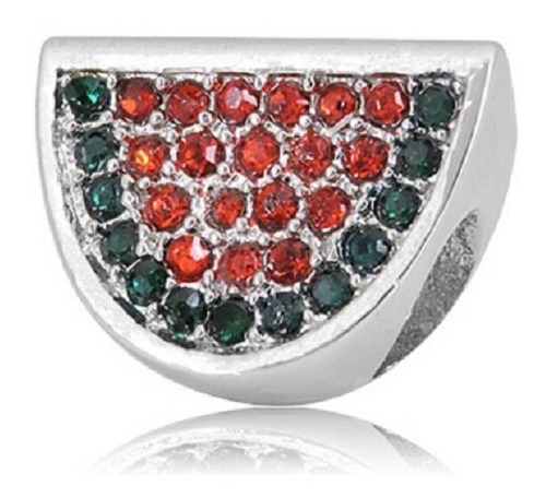 Berloque Melancia com Strass<br /> <br /> Material: aço inoxidável<br /> <br /> Furo: Ø5mm<br /> <br /> *** Peças em aço inox:<br /> <br /> Você pode entrar no mar, na piscina, no banho com suas joias sem se preocupar, o aço inox é um metal resistente, não escurece e nem enferruja em contato com a água salgada;<br /> Não fica preta e nem descasca porque não oxida, para dar brilho basta passar uma flanela mágica que está resolvido;<br /> Se você é alérgico o mais recomendado é usar o aço inox para não causar alergias. Lembrando que pode haver pessoas com alergia a esse aço, não está descartada a possibilidade.
