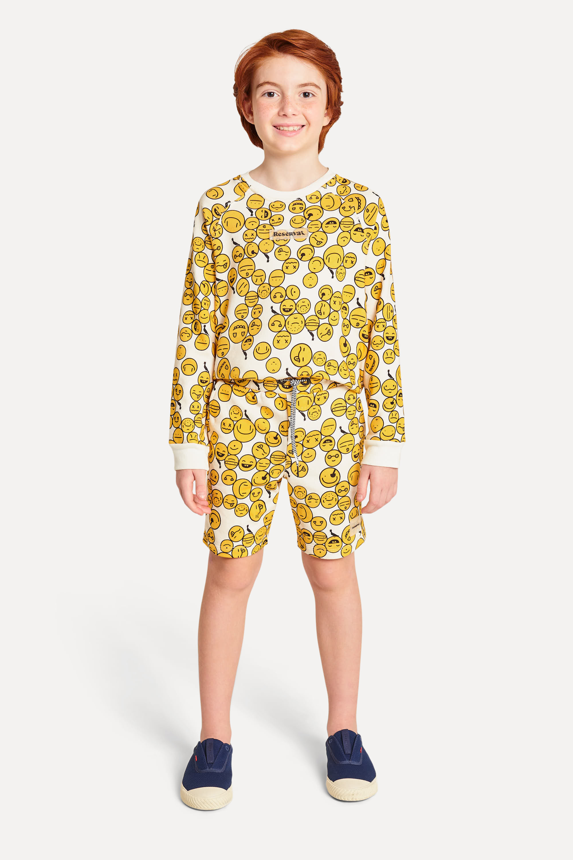 Bermuda da linha infantil Reserva Mini. O modelo básico tem bolsos faca na frente e bolso traseiro e ganhou divertida estampa exclusiva Happy Emoji. Possui cadarço listrado com regulagem do cós, fazendo um mix de estampas. Peça cheia de estilo para o dia a dia! Produzido eticamente no Brasil. Comprando esta peça, você complementa cinco pratos de comida através do nosso programa 1P=5P.