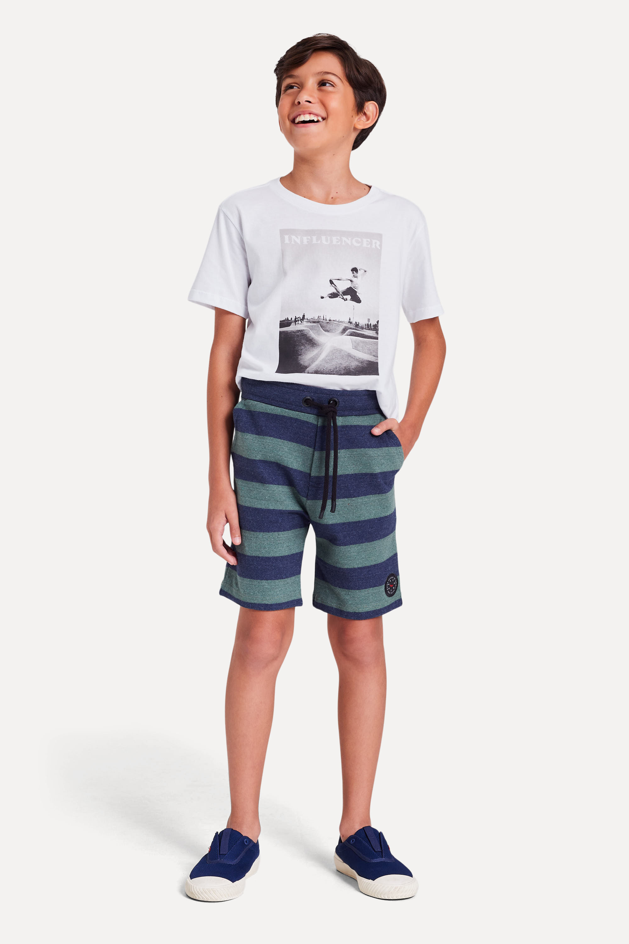 Bermuda da linha infantil Reserva Mini. Em moletom com listras largas, o modelo tem cadarço para ajuste no cós e bolsos faca na frente e atrás. Dupla perfeita de camiseta para o dia a dia confortável da criançada! Produzido eticamente no Brasil. Comprando esta peça, você complementa cinco pratos de comida através do nosso programa 1P=5P.