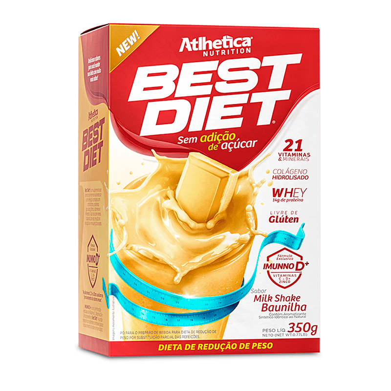 <p>A <strong>Best Diet Milk Shake Baunilha Atlhetica 350g</strong> é a nova geração de shakes para dietas de redução de peso. Com fórmula balanceada, reunindo nutrientes que auxiliam na saúde de cabelos, pele e unha, além de manter a massa muscular, com 21 vitaminas e minerais. Contém, ainda, a imunno d+, exclusiva combinação de zinco e vitaminas c e d+, mantendo o sistema imune fortalecido.</p> Sobre os ingredientes: <p>Maltodextrina, amido de milho, formula best diet (proteína isolada de soja, soro de leite em pó, proteína concentrada do soro de leite, colágeno hidrolisado), óleo de palma em pó, mix de vitaminas e minerais [vitamina a (acetato de retinol), vitamina b1 (mononitrato de tiamina), vitamina b2 (riboflavina), vitamina b3 (nicotinamida), vitamina b5 (pantotenato de cálcio), vitamina b6 (piridoxina hcl), vitamina b12 (cianocobalamina), vitamina e (acetato de tocoferol), vitamina h (biotina), vitamina b9 (ácido fólico), cálcio (fosfato tricálcico anidro), fósforo (pirofosfato férrico), magnésio (óxido de magnésio), ferro (pirofosfato férrico), cobre (óxido de cobre), iodo (iodeto de potássio), selênio (selenito de sódio), manganês (sulfato de manganês)], formula imunno d+ [vitamina c (ácido ascórbico), zinco (sulfato de zinco monohidratado) e vitamina d (colecalciferol)], goma xantana, aromatizantes, acidulante ácido cítrico, edulcorante sucralose e corante artificial vermelho 40.</p> <p>Não contém Glúten. Contém lactose.</p> Alergênicos: contém derivados de leite e soja. Sugestão de uso: <p>Adicione 35g (4 colheres de sopa cheias) em 330 ml (2 copos) de leite desnatado e bata no liquidificador.</p> Motivos para escolher o produto: <ul> <li> <p>Imunno D</p> </li> <li> <p>Colágeno Hidrolisado</p> </li> <li> <p>Não contém Glúten e açúcar</p> </li> </ul>Sobre a marca: <p>A <strong>Atlhetica</strong>, é uma empresa no qual os produtos são desenvolvidos pela ADS Laboratório Nutricional, que produz suplementos alimentares inovadores com alta qualidade e tecnologia avançada, é considerada a maior indústria de suplementos alimentares do Brasil. Os são fabricados seguindo as normas estabelecidas pela ANVISA (Agência Nacional de Vigilância Sanitária) e pelas Boas Práticas de Fabricação (BPF), proporcionando a qualidade, bem-estar e a eficácia que os consumidores tanto desejam.</p>