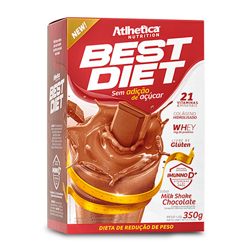 <p>A <strong>Best Diet Milk Shake Chocolate Atlhetica 350g</strong> é a nova geração de shakes para dietas de redução de peso. Com fórmula balanceada, reunindo nutrientes que auxiliam na saúde de cabelos, pele e unha, além de manter a massa muscular, com 21 vitaminas e minerais. Contém, ainda, a imunno d+, exclusiva combinação de zinco e vitaminas c e d+, mantendo o sistema imune fortalecido.</p> Sobre os ingredientes: <p>Maltodextrina, amido de milho, formula best diet (proteína isolada de soja, soro de leite em pó, proteína concentrada do soro de leite, colágeno hidrolisado), óleo de palma em pó, mix de vitaminas e minerais [vitamina a (acetato de retinol), vitamina b1 (mononitrato de tiamina), vitamina b2 (riboflavina), vitamina b3 (nicotinamida), vitamina b5 (pantotenato de cálcio), vitamina b6 (piridoxina hcl), vitamina b12 (cianocobalamina), vitamina e (acetato de tocoferol), vitamina h (biotina), vitamina b9 (ácido fólico), cálcio (fosfato tricálcico anidro), fósforo (pirofosfato férrico), magnésio (óxido de magnésio), ferro (pirofosfato férrico), cobre (óxido de cobre), iodo (iodeto de potássio), selênio (selenito de sódio), manganês (sulfato de manganês)], formula imunno d+ [vitamina c (ácido ascórbico), zinco (sulfato de zinco monohidratado) e vitamina d (colecalciferol)], goma xantana, aromatizantes, acidulante ácido cítrico, edulcorante sucralose e corante artificial vermelho 40.</p> <p>Não contém Glúten. Contém lactose.</p> Alergênicos: contém derivados de leite e soja. Sugestão de uso: <p>Adicione 35g (4 colheres de sopa cheias) em 330 ml (2 copos) de leite desnatado e bata no liquidificador.</p> Motivos para escolher o produto: <ul> <li> <p>Imunno D</p> </li> <li> <p>Colágeno Hidrolisado</p> </li> <li> <p>Não contém Glúten e açúcar</p> </li> </ul>Sobre a marca: <p>A <strong>Atlhetica</strong>, é uma empresa no qual os produtos são desenvolvidos pela ADS Laboratório Nutricional, que produz suplementos alimentares inovadores com alta qualidade e tecnologia avançada, é considerada a maior indústria de suplementos alimentares do Brasil. Os são fabricados seguindo as normas estabelecidas pela ANVISA (Agência Nacional de Vigilância Sanitária) e pelas Boas Práticas de Fabricação (BPF), proporcionando a qualidade, bem-estar e a eficácia que os consumidores tanto desejam.</p>