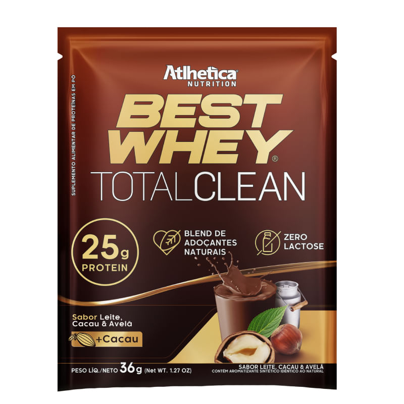 <p>A proteína Best Whey Total Clean sabor leite, cacau e avelã da Atlhetica Nutrition possui uma fórmula livre de lactose, glúten e é sem adição de açúcares. Ela é elaborada com um blend de whey protein concentrado, isolado e hidrolisado, que garante 25g de proteínas por dose.</p> <h2><strong>Sobre os ingredientes:</strong></h2> <p>Whey protein concentrado (WPC): suplemento alimentar proteico extraído do soro do leite por processo de filtragem. A proteína atua no organismo na manutenção, reparo e aumento da massa muscular.</p> <p>Whey protein isolado (WPI): passa por um processo minucioso de filtragem, eliminando a lactose e a caseína. </p> <p>Whey protein hidrolisado (WPH): além de ter um processo minucioso de filtragem, essa proteína passa por um processo chamado hidrólise, onde as moléculas de proteínas são quebradas em segmentos ainda menores, chamados peptídeos, o que torna a digestão e absorção mais fácil pelo organismo. </p> <h2><strong>Sugestão de consumo:</strong></h2> <p>Em um liquidificador ou coqueteleira diluir 1 sachê (36g) em 150ml de água ou conforme orientação do médico ou nutricionista.</p> <h2><strong>Motivos para escolher o produto:</strong></h2> <ul> <li> <p>Sem glúten e sem lactose;</p> </li> <li> <p>Feito com 3 tipos de whey protein;</p> </li> <li> <p>Zero adição de açúcares;</p> </li> <li> <p>25g de proteína por dose;</p> </li> <li> <p>Dose individual; </p> </li> <li> <p>Em sachê: prático para transporte.</p> </li> </ul> <h2><strong>A Marca</strong></h2> <p>A Atlhetica Nutrition é referência no mercado de suplementação, a marca está há mais de 20 anos fabricando suplementos alimentares com foco em sabor, saúde, força e energia para todos os tipos de treinos. A Atlhetica conquistou reconhecimento com produtos excelentes e inovadores, fabricados de acordo com as normas, proporcionando a qualidade e a eficácia que os consumidores tanto desejam.</p> <p> </p>