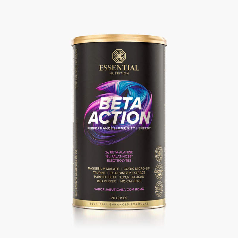 <p>O <strong>Beta Action sabor Jabuticaba com Romã Essential Nutrition,</strong> é uma combinação de carboidratos, em destaque a Palatinose®, Beta-alanina, taurina, eletrólitos e vitaminas, uma união perfeita de nutrientes energéticos com o frescor da jabuticaba. Sem cafeína, sua fórmula é ideal para quem pratica atividade física em períodos noturnos, favorecendo para uma maior disposição e a reposição hidroeletrolítica. </p> <h2><strong>Sobre os ingredientes:</strong></h2> <p><strong>Palatinose</strong><strong>®</strong><strong>: </strong>carboidrato obtido a partir da beterraba que possui baixo índice glicêmico, sendo fonte de energia constante e prolongada para o organismo;</p> <p><strong>Beta-alanina:</strong> aminoácido com ação na fadiga muscular;</p> <p><strong>Taurina:</strong> aminoácido com propriedades energéticas e com ação moduladora da excitabilidade cerebral;</p> <p><strong>Eletrólitos:</strong> minerais responsáveis por transportar água para dentro das células, favorecendo uma hidratação mais eficiente e repondo as perdas que ocorrem através do suor.<strong> </strong></p> <h2><strong>Sugestão de consumo:</strong></h2> <p>Dilua 1 scoop (31,5g) em aproximadamente 300ml de água gelada. Pode ser consumido antes e durante a prática de atividade física ou fracionado em pequenas doses ao longo do dia ou conforme recomendação do nutricionista.</p> <h2><strong>Motivos para escolher o produto: </strong></h2> <ul> <li>Não possui cafeína; </li> <li> <p>Pode ser consumido como pré-treino durante a noite, pois não interfere no sono;</p> </li> <li> <p>Atua como repositor de eletrólitos; </p> </li> <li> <p>Contém coenzima Q10 e Betaglucana;</p> </li> <li> <p>Adoçado com adoçante natural stévia; </p> </li> <li> <p>Fonte de vitaminas do complexo B.</p> </li> </ul> <h2><strong>A Marca</strong></h2> <p>A <strong>Essential Nutrition </strong>é uma marca especializada em nutrição funcional, produzindo produtos de extrema qualidade, utilizando as melhores matérias-primas e em suas concentrações ideias, excluindo o uso de ingredientes geneticamente modificados, glúten, lactose, corantes, conservantes e adoçantes artificiais.</p> <p> </p>