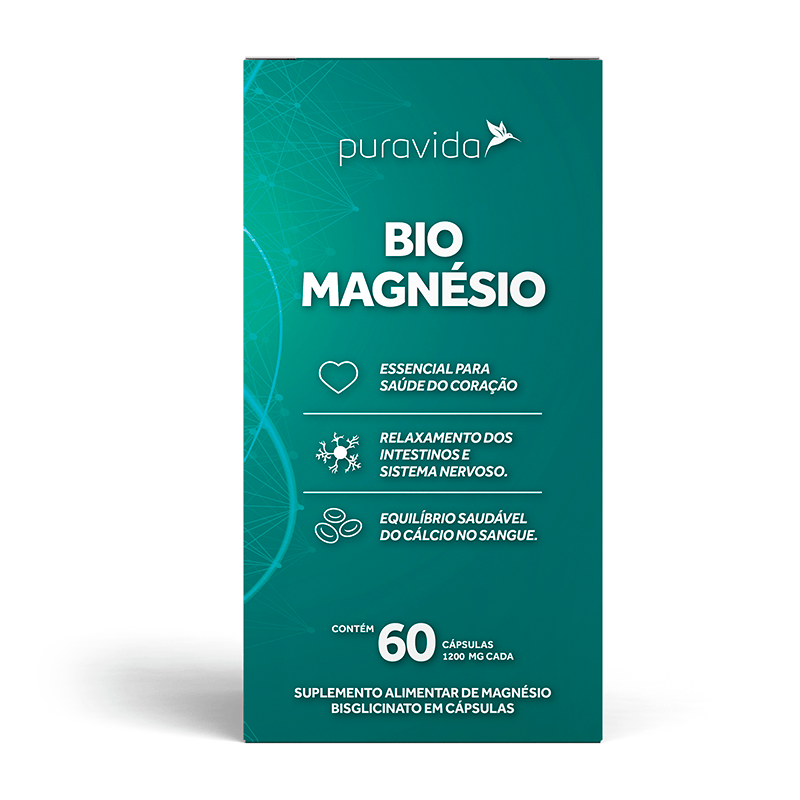 <p>O <strong>Bio Magnésio Pura Vida 1200mg com 60 cápsulas</strong>, é um suplemento que fornece 350mg de magnésio bisglicinato na porção. Apresenta ótima biodisponibilidade, sem efeito colateral e dosagem ideal.</p> Sobre os ingredientes: <p><strong>Magnésio: </strong>auxilia no metabolismo da glicose, na produção de proteínas e energia e na manutenção da glicemia e insulina. Também auxilia na saúde óssea e do coração, no funcionamento muscular, do sistema nervoso e dos intestinos.</p> Sugestão de consumo: <p>Consumir 1 ou 2 cápsulas por dia junto com 1 copo de água, preferencialmente no período da noite ou de acordo com a recomendação do médico ou nutricionista.</p> Motivos para escolher o produto: <ul> <li> <p>98% de absorção</p> </li> <li> <p>Fórmula sem efeitos indesejáveis</p> </li> <li> <p>Atende 135% da recomendação diária de magnésio na porção</p> </li> <li> <p>Não contém Glúten</p> </li> </ul> Sobre a marca: <p>A <strong>Pura Vida</strong> é uma empresa com o propósito de promover uma alimentação sem comidas artificiais, pobres em nutrientes, ricas em conservantes, pesticidas, gorduras hidrogenadas ou com açúcar em excesso. Preocupa-se, com o impacto da alimentação na qualidade de vida e no meio ambiente, utilizando produtos frescos e de produção recente obtidos de cultivadores confiáveis e além de utilizar tecnologias para preservar, realçar e concentrar as propriedades dos alimentos.</p>