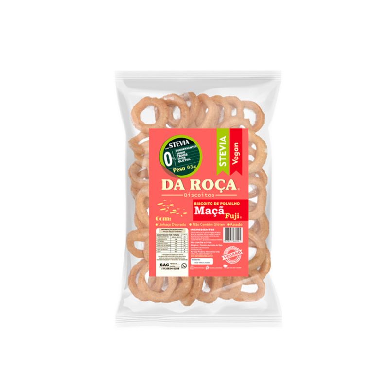 <p dir="ltr">O <strong>Biscoito de polvilho</strong> da marca <strong>Da Roça</strong>, sabor maçã, possui como base ingredientes naturais, como maçã fuji, canela em pó, semente de linhaça dourada e sal rosa do himalaia, não contém glúten e nem lactose. Perfeito para quem procura um snack com crocância e sabor.</p> <p> </p> <h2 dir="ltr">Sobre os ingredientes:</h2> <p dir="ltr"><strong>Alérgicos:</strong> contém derivados de soja;</p> <p dir="ltr"><strong>Maçã fuji</strong>: fonte de fibras, fósforo e vitaminas do complexo B;</p> <p dir="ltr"><strong>Canela:</strong> rica em micronutrientes, contribui para melhora da memória e foco;</p> <p dir="ltr"><strong>Linhaça dourada:</strong> rica em ômega 3, contribui para a saúde cardiovascular e cerebral;</p> <p dir="ltr"><strong>Sal rosa do himalaia:</strong> contém minerais que contribuem para o equilíbrio eletrolítico do organismo.</p> <h2> </h2> <h2 dir="ltr">Sugestão de consumo:</h2> <p dir="ltr">Ideal para lanches intermediários, na escola, trabalho, academia, faculdade, ou em qualquer outro lugar.</p> <h2 dir="ltr"> </h2> <h2 dir="ltr">Motivos para escolher o produto:</h2> <ul> <li dir="ltr"> <p dir="ltr">Sem glúten;</p> </li> <li dir="ltr"> <p dir="ltr">Sem Lactose;</p> </li> <li dir="ltr"> <p dir="ltr">É assado;</p> </li> <li dir="ltr"> <p dir="ltr">Não contém aroma artificial;</p> </li> <li dir="ltr"> <p dir="ltr">À base de Ingredientes naturais;</p> </li> <li dir="ltr"> <p dir="ltr">Opção para veganos e vegetarianos.</p> </li> </ul> <h2 dir="ltr">A Marca</h2> <p dir="ltr">Há 29 anos no mercado, a empresa <strong>Da Roça</strong> tem como foco a inovação e atualização dos seus produtos e da marca. Possuem como base a produção de biscoitos de polvilhos únicos, com sabores diferenciados que conquistam os consumidores.</p> <p dir="ltr">Atualmente possuem duas linhas de produtos, a Nature e a Vegan, que estão em crescente pelo Brasil e exterior. </p>