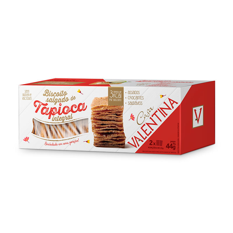 <p>Os <strong>Biscoitos de Tapioca Integral Casa Valentina 44g</strong> são saudáveis e crocantes. Ótimos para consumir sozinhos ou com cremes e patês. Um delicioso snack para qualquer hora!</p> Sobre os ingredientes: <p>Goma de tapioca, flocos de batata desidratados, farinha de linhaça marrom, gordura de palma, fibra de maçã e sal light.</p> Motivos para escolher o produto: <ul> <li> <p>Assado e saudável</p> </li> <li> <p>Sem lactose</p> </li> <li> <p>Sem glúten</p> </li> <li> <p>Livre de gorduras trans</p> </li> <li> <p>Crocantes e deliciosos</p> </li> </ul> Precauções: <p>Pode conter ovos, amendoim, soja, avelã, castanha de caju, castanha do Pará, amêndoa, macadâmia, nozes, pecã, pistache, castanhas e látex natural.</p> Sobre a marca: <p>A <strong>Casa Valentina</strong> acredita que é possível ser saudável sem perder o sabor. É assim que conquistamos a preferência de tanta gente: com produtos leves, práticos e que agradam o paladar.</p>