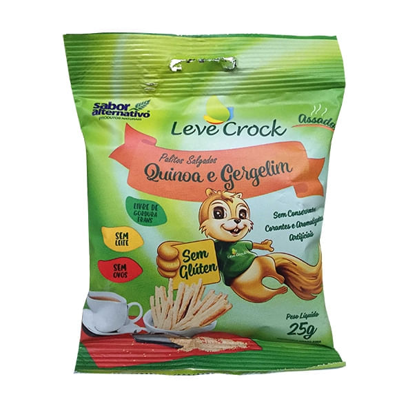 <p>Informações técnicas do produto:<br>Biscoito Palitos, Quinoa e Gergelim, 25g, 1 Unidade, Sabor Alternativo são biscoitos palitos salgados no sabor de quinoa e gergelim. Ótima opção de snack, ele é totalmente livre de glúten, leite e ovos e não possui conservantes, corantes e aromatizantes artificiais, sendo perfeito para um lanche intermediário mais saudável.<br><br>Recomendação de consumo:<br>Pode ser consumido como snack.<br><br>Informações sobre alergênicos:<br>Contém lecitina de soja e pode conter amêndoa.<br><br>Por que escolher esse produto?:<br>Sem glúten<br>Sem lactose<br>Sem ovo<br>Sem conservantes artificiais<br>Sem aromatizantes artificiais<br>Sem corantes artificiais</p>