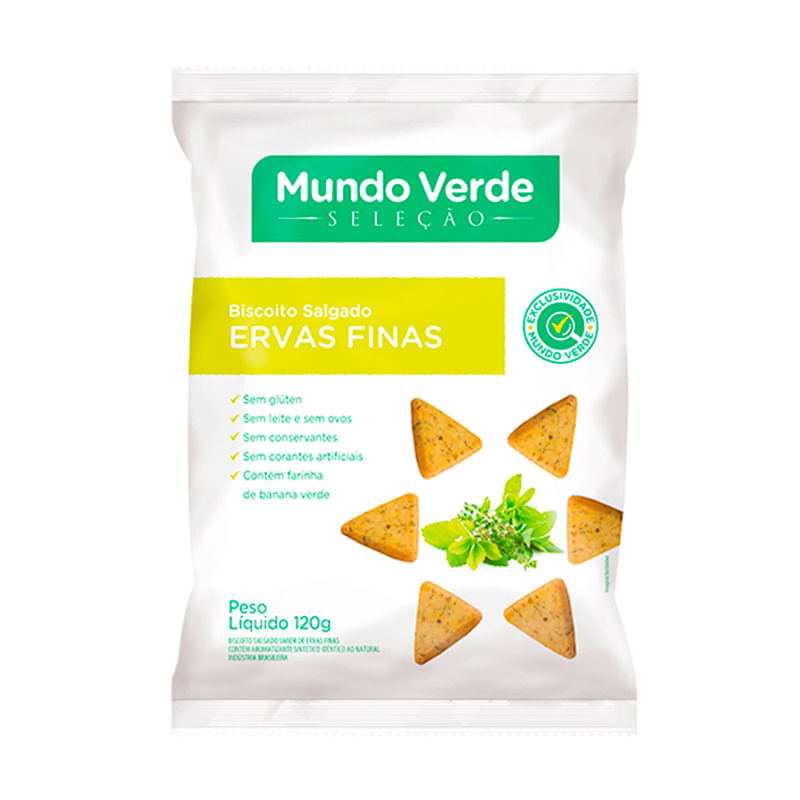 <p>O <strong>Biscoito Salgado</strong> sem glúten <strong>ervas finas</strong> <strong>Mundo Verde Seleção </strong>é feito com farinha de banana verde com sabor ervas finas, é uma opção de snack salgada para pessoas com restrições alimentares, pois é livre dos principais alergênicos alimentares: sem glúten, sem leite e sem ovos. Além disso, também não contém conservantes e nem corantes artificiais.</p> Sugestão de consumo: <p>Ideal para consumir no intervalo das refeições, como lanches ou petisco.</p> Motivos para escolher o produto: <ul> <li> <p>Sem adição de conservantes e corante artificial</p> </li> <li> <p>Isento leite</p> </li> <li> <p>Sem ovo</p> </li> <li> <p>Não contém Glúten</p> </li> <li> <p>Baixo em gorduras</p> </li> </ul> Sobre a marca: <p>A <strong>Mundo Verde Seleção </strong>é uma linha de produtos para quem quer ter uma vida mais saudável e gostosa. A marca quer ajudar a colocar essas escolhas em prática. A paixão e conhecimento pelos alimentos, nutrientes, aromas e sabores permitem a seleção das melhores opções saudáveis para qualquer ocasião. Conheça a linha completa Mundo Verde Seleção, com inúmeros produtos saudáveis e gostosos para facilitar seu dia a dia.</p>