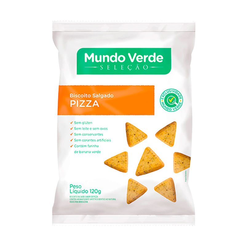 <p>O <strong>Biscoito Salgado</strong> sem glúten sabor <strong>pizza Mundo Verde Seleção </strong>é feito com farinha de banana verde, sabor de pizza, é uma opção de snack salgada para pessoas com restrições alimentares, pois é livre dos principais alergênicos alimentares: sem glúten, sem leite e sem ovos. Além disso, também não contém conservantes e nem corantes artificiais.</p> Sugestão de consumo: <p>Ideal para consumir no intervalo das refeições, como lanches ou petisco.</p> Motivos para escolher o produto: <ul> <li> <p>Sem adição de conservante e corante artificial</p> </li> <li> <p>Isento leite</p> </li> <li> <p>Sem ovo</p> </li> <li> <p>Não contém Glúten</p> </li> <li> <p>Baixo em gorduras</p> </li> </ul> Sobre a marca: <p>A <strong>Mundo Verde Seleção </strong>é uma linha de produtos para quem quer ter uma vida mais saudável e gostosa. A marca quer ajudar a colocar essas escolhas em prática. A paixão e conhecimento pelos alimentos, nutrientes, aromas e sabores permitem a seleção das melhores opções saudáveis para qualquer ocasião. Conheça a linha completa Mundo Verde Seleção, com inúmeros produtos saudáveis e gostosos para facilitar seu dia a dia.</p>