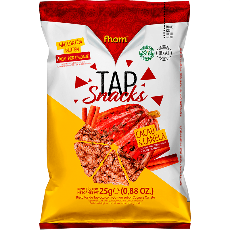 <p>Informações técnicas do produto: <br>O Biscoito Tap Snack Cacau e Canela, da Fhom, contém 25g, é produzido com tapioca e quinoa vermelha e recebe uma base de óleo de coco com sabor natural do cacau e canela, deixando o produto com sabor doce. Possui certificado de produto vegano.<br><br>Recomendação de consumo:<br>Pode ser consumido a qualquer hora do dia, sendo também uma boa de opção de petiscos.<br><br>Por que escolher esse produto?<br>Sem conservantes artificiais<br>Sem aditivos de cor e sabor<br>100% natural<br>Não contém glúten<br>Produzido com sal light<br>2 kcal por unidade<br>Isento de gorduras trans<br>Certificado Kosher e Vegano<br>Sobre a marca:<br>A Fhom, é uma empresa criada em 1994, que possui como objetivo fornecer produtos de qualidade superior aos clientes, respeitando princípios como inovação tecnológica, apresentação diferenciada e extremo cuidado na fabricação. Atualmente possui produtos com certificado orgânico ECOCERT e SVB, além de todos serem feitos com o mais restrito controle, para garantir a não contaminação com glúten, lactose e outros ingredientes alergênicos.</p>