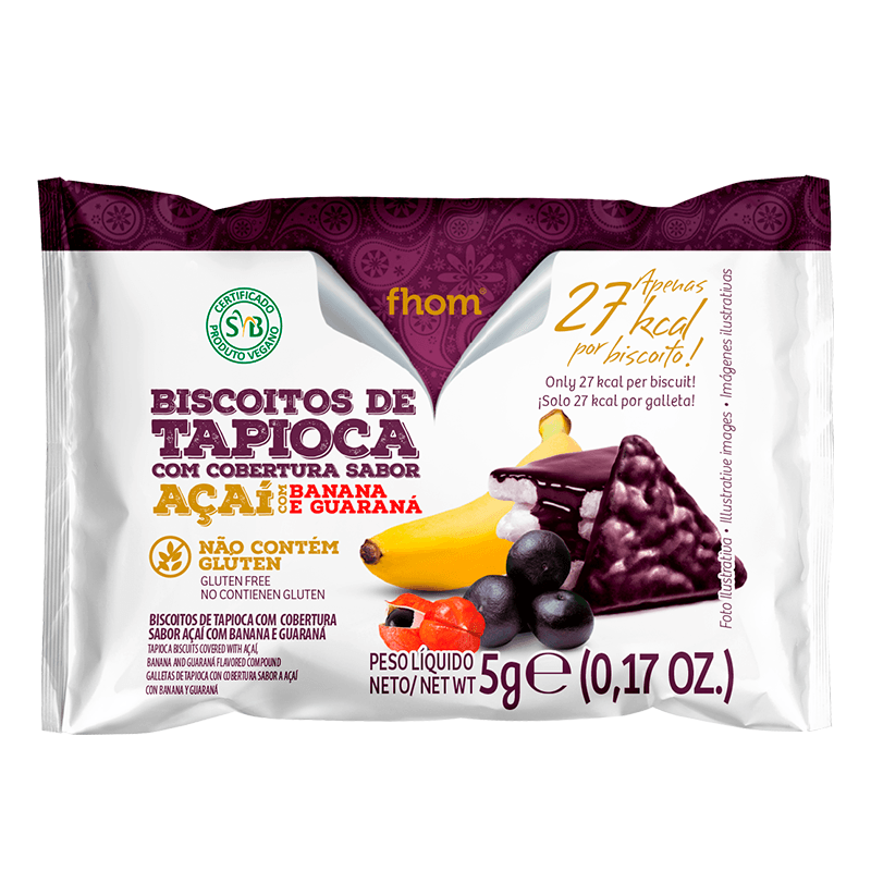<p>O <strong>Biscoito de Tapioca com Açaí Banana Guaraná Fhom 5g</strong> é uma ótima opção para quem busca por uma alimentação equilibrada sem abrir mão daquele docinho, que adoça a vida e que todos amam.</p> Sobre os ingredientes: Alergênicos: contém derivados de soja. Motivos para escolher o produto: <ul> <li> <p>Sem glúten</p> </li> <li> <p>Sem adição de açúcares</p> </li> <li> <p>0% gordura trans</p> </li> <li> <p>Sem soja</p> </li> <li> <p>Sem colesterol</p> </li> <li> <p>Sem conservantes</p> </li> <li> <p>100% natural</p> </li> <li> <p>Sem ovo</p> </li> </ul> Sobre a marca: <p>A <strong>Fhom</strong> é uma empresa criada em 1994, que possui como objetivo fornecer produtos de qualidade superior aos clientes, respeitando princípios como inovação tecnológica, apresentação diferenciada e extremo cuidado na fabricação. Atualmente possui produtos com certificado orgânico ECOCERT e SVB, além de todos serem feitos com o mais restrito controle, para garantir a não contaminação com glúten, lactose e outros ingredientes alergênicos.</p>