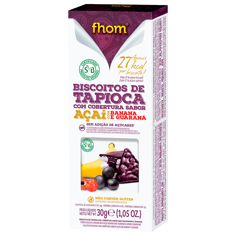 <p>O <strong>Biscoito Tapioca com Açaí Fhom 30g</strong> é uma ótima opção para quem busca por uma alimentação equilibrada sem abrir mão daquele docinho, que adoça a vida e que todos amam.</p> Sobre os ingredientes: Alergênicos: contém derivados de soja. Motivos para escolher o produto: <ul> <li> <p>Sem glúten</p> </li> <li> <p>Sem adição de açúcares</p> </li> <li> <p>0% gordura trans</p> </li> <li> <p>Sem soja</p> </li> <li> <p>Sem colesterol</p> </li> <li> <p>Sem conservantes</p> </li> <li> <p>100% natural</p> </li> <li> <p>Sem ovo</p> </li> </ul> Sobre a marca: <p>A <strong>Fhom</strong> é uma empresa criada em 1994, que possui como objetivo fornecer produtos de qualidade superior aos clientes, respeitando princípios como inovação tecnológica, apresentação diferenciada e extremo cuidado na fabricação. Atualmente possui produtos com certificado orgânico ECOCERT e SVB, além de todos serem feitos com o mais restrito controle, para garantir a não contaminação com glúten, lactose e outros ingredientes alergênicos.</p>
