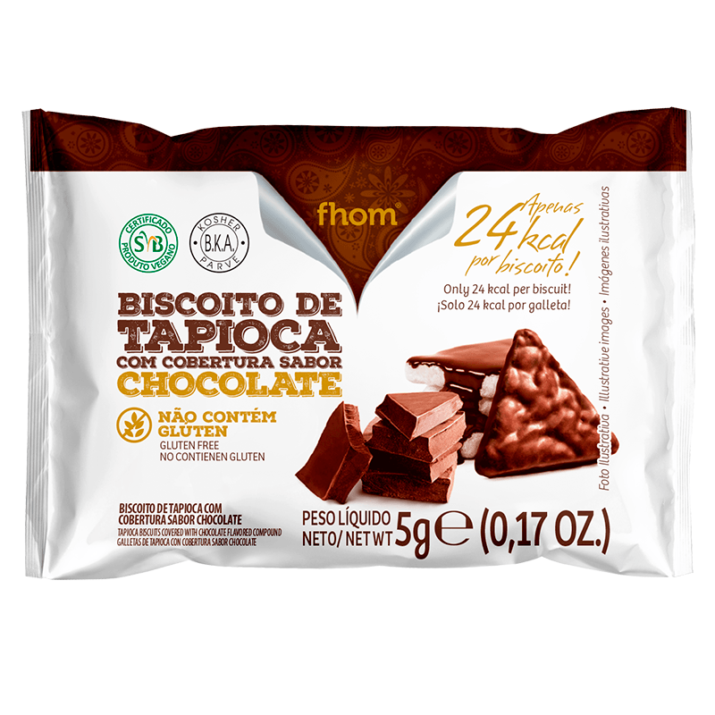 <p>O <strong>Biscoito Tapioca com Chocolate Fhom 5g</strong> é uma ótima opção para quem busca por uma alimentação equilibrada sem abrir mão daquele docinho, que adoça a vida e que todos amam.</p> Alergênicos: contém derivados de soja. Motivos para escolher o produto: <ul> <li> <p>Sem glúten</p> </li> <li> <p>Sem adição de açúcares</p> </li> <li> <p>0% gordura trans</p> </li> <li> <p>Sem soja</p> </li> <li> <p>Sem colesterol</p> </li> <li> <p>Sem conservantes</p> </li> <li> <p>Sem lactose</p> </li> <li> <p>100% natural</p> </li> <li> <p>Sem ovo</p> </li> </ul> Sobre a marca: <p>A <strong>Fhom</strong> é uma empresa criada em 1994, que possui como objetivo fornecer produtos de qualidade superior aos clientes, respeitando princípios como inovação tecnológica, apresentação diferenciada e extremo cuidado na fabricação. Atualmente possui produtos com certificado orgânico ECOCERT e SVB, além de todos serem feitos com o mais restrito controle, para garantir a não contaminação com glúten, lactose e outros ingredientes alergênicos.</p>