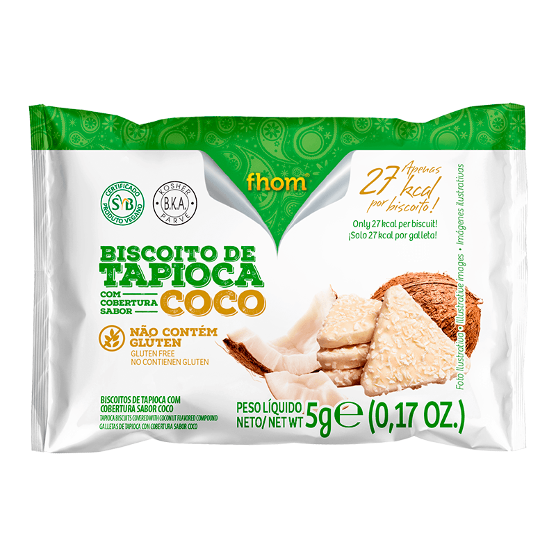 <p>O <strong>Biscoito Tapioca com Coco Fhom 5g</strong> é uma ótima opção para quem busca por uma alimentação equilibrada sem abrir mão daquele docinho, que adoça a vida e que todos amam.</p> Sobre os ingredientes: Alergênicos: contém derivados de soja. Motivos para escolher o produto: <ul> <li> <p>Sem glúten</p> </li> <li> <p>Sem adição de açúcares</p> </li> <li> <p>0% gordura trans</p> </li> <li> <p>Sem soja</p> </li> <li> <p>Sem colesterol</p> </li> <li> <p>Sem conservantes</p> </li> <li> <p>100% natural</p> </li> <li> <p>Sem ovo</p> </li> </ul> Sobre a marca: <p>A <strong>Fhom</strong> é uma empresa criada em 1994, que possui como objetivo fornecer produtos de qualidade superior aos clientes, respeitando princípios como inovação tecnológica, apresentação diferenciada e extremo cuidado na fabricação. Atualmente possui produtos com certificado orgânico ECOCERT e SVB, além de todos serem feitos com o mais restrito controle, para garantir a não contaminação com glúten, lactose e outros ingredientes alergênicos.</p>