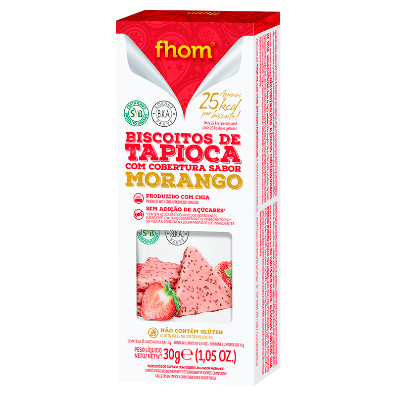 <p>O <strong>Biscoito Tapioca com Morango Fhom 30g</strong> é uma ótima opção para quem busca por uma alimentação equilibrada sem abrir mão daquele docinho, que adoça a vida e que todos amam.</p> Sobre os ingredientes: Alergênicos: contém derivados de soja. Motivos para escolher o produto: <ul> <li> <p>Sem glúten</p> </li> <li> <p>Sem adição de açúcares</p> </li> <li> <p>0% gordura trans</p> </li> <li> <p>Sem soja</p> </li> <li> <p>Sem colesterol</p> </li> <li> <p>Sem conservantes</p> </li> <li> <p>100% natural</p> </li> <li> <p>Sem ovo</p> </li> </ul> Sobre a marca: <p>A <strong>Fhom</strong> é uma empresa criada em 1994, que possui como objetivo fornecer produtos de qualidade superior aos clientes, respeitando princípios como inovação tecnológica, apresentação diferenciada e extremo cuidado na fabricação. Atualmente possui produtos com certificado orgânico ECOCERT e SVB, além de todos serem feitos com o mais restrito controle, para garantir a não contaminação com glúten, lactose e outros ingredientes alergênicos.</p>