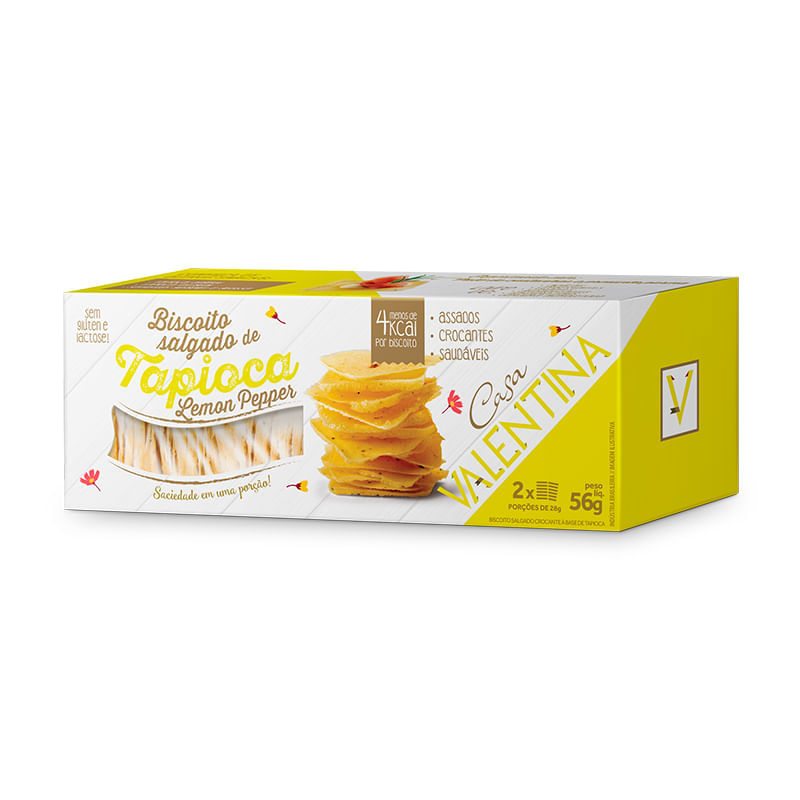 <p>Assado e crocante, o <strong>Biscoito Tapioca Lemon Pepper Casa Valentina 56g</strong> é fininho e levemente picante. Ideal para um lanche rápido a qualquer hora do dia.</p> Sobre os ingredientes: <p>Goma de tapioca, flocos de batata desidratados, gordura de palma, condimento lemon pepper, sal light, emulsificante ésteres de mono e diglicerídeos de ácidos graxos.</p> Motivos para escolher o produto: <ul> <li> <p>Assado e saudável</p> </li> <li> <p>Sem lactose</p> </li> <li> <p>Sem glúten</p> </li> <li> <p>Livre de gorduras trans</p> </li> <li> <p>Crocantes e deliciosos</p> </li> </ul> Precauções: <p>Pode conter ovos, amendoim, soja, avelã, castanha-de-caju, castanha-do-pará, amêndoa, macadâmia, nozes, pecã, pistache, castanhas e látex natural.</p> Sobre a marca: <p>A <strong>Casa Valentina</strong> acredita que é possível ser saudável sem perder o sabor. É assim que conquistamos a preferência de tanta gente: com produtos leves, práticos e que agradam o paladar.</p>