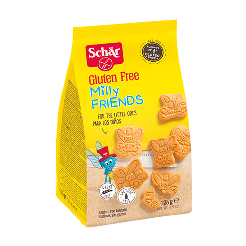 <p>Informações técnicas do produto: <br><br>Milly & Friends Schär é um biscoito doce sem glúten, sem adição de corantes, conservantes e gorduras hidrogenadas (gordura trans). Indicado para todos que seguem uma alimentação livre de glúten ou que seja doente celícado. Pode ser consumido em alternativa aos biscoitos tradicionais, entre as principais refeições. AVISO: Produto frágil e sujeito a danos durante o transporte!</p>