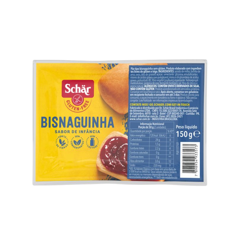 <h2 style="text-align: justify;"><strong>Pão tipo Bisnaguinha sem glúten sem lactose 150g Schär </strong></h2> <h2 style="text-align: justify;">O <strong>Pão tipo bisnaguinha sem glúten e lactose</strong> da <strong>Schär</strong>, é levemente salgado e remete toda memória afetiva da infância. Elaborado com sem glúten, sem lactose e sem adição de leite, é perfeito para lanches deliciosos, com praticidade e sabor.</h2> <h2 style="text-align: justify;"><strong>Sobre os ingredientes:</strong></h2> <h2 style="text-align: justify;"><strong>Alérgicos</strong>: contém ovos e derivados de soja.</h2> <h2 style="text-align: justify;"><strong>Sugestão de consumo:</strong></h2> <h2 style="text-align: justify;">Para consumir no café da manhã ou lanches intermediários. Tenha sempre na bolsa ou na mochila uma opção saudável e de fácil transporte. Para lanches escolares, trabalho, academia, faculdade, ou em qualquer outro lugar. <strong> </strong></h2> <h2 style="text-align: justify;"><strong>Motivos para escolher o produto:</strong></h2> <h2 style="text-align: justify;">● Produto sem glúten; </h2> <h2 style="text-align: justify;">● Sem lactose;</h2> <h2 style="text-align: justify;">● Sem leite (APLV);</h2> <h2 style="text-align: justify;">● Elabora com psyllium, contém fibras.</h2> <h2 style="text-align: justify;"> </h2> <h2 style="text-align: justify;"><strong>A Marca</strong></h2> <h2 style="text-align: justify;">Feito com o melhor de nós</h2> <h2 style="text-align: justify;">Inaugurada em 1922, a Schär, acredita que não importa o quanto as coisas possam mudar, a comida sempre terá o poder de nos unir. A melhor maneira de fazer com que todos se sintam em casa é preparar uma refeição na qual cada um esteja incluído. É por isso que a Schär utiliza apenas os <strong>melhores cereais e grãos</strong> para adaptar aos gostos e necessidades únicas de cada um. “Pois o mais importante não é só desenvolver <strong>produtos sem glúten</strong>, mas também fazê-los com o melhor de nós.”</h2>